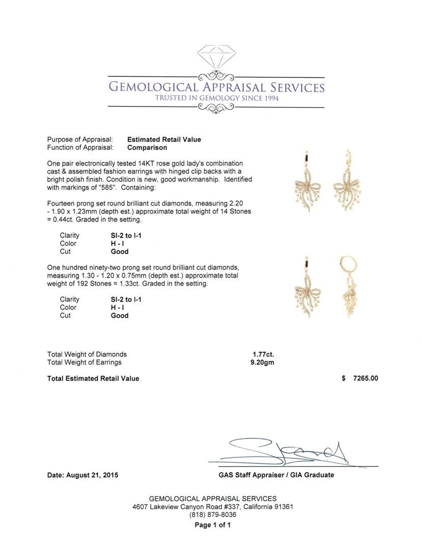 One pair electronically tested 14KT rose gold lady's combination cast & assembled fashion earrings with hinged clip backs with a bright polish finish. Identified with markings of "585". Condition is new, good workmanship. Containing: Fourteen prong set round brilliant cut diamonds, measuring 2.20 - 1.90 x 1.23mm (depth est.) approximate total weight of 14 Stones = 0.44ct. Graded in the setting. Clarity: SI-2 to I-1. Color: H - I. Cut Good One Hundred Ninety-Two prong set round brilliant cut diamonds, measuring 1.30 - 1.20 x 0.75mm (depth est.) approximate total weight of 192 Stones = 1.33ct. Graded in the setting. Clarity: SI-2 to I-1. Color: H - I. Cut Good. Total Weight of Diamonds 1.77ct. Total Weight of Earrings 9.20gm. GAS Appraised at $7,265.00.