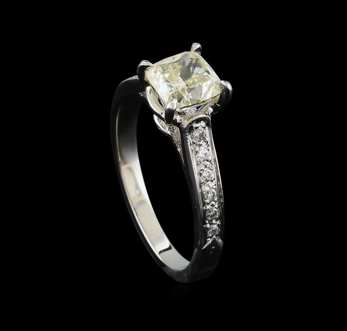 One electronically tested 14KT white gold ladies cast diamond unity ring with a bright polish finish. The featured diamond is supported by diamond set shoulders, completed by a two millimeter wide band. Identified with markings of "14K". Condition is new, good workmanship. Containing: One prong set cushion cut diamond, measuring 6.29 x 6.14 x 4.58mm (depth est.), 6.00.%. GTCF approximate weight of 1.62ct with a strong blue fluorescence. Graded in the setting. Clarity: I-1. Color: 74.6%. Table 70.0%. Twelve bead set round brilliant cut diamonds, measuring 1.40 - 1.30 x 0.81mm (depth est.) approximate total weight of 12 Stones = 0.15ct. Graded in the setting. Clarity: SI-1 to SI-2. Color: F - G. Total Weight of Diamonds 1.77ct. Total Weight of Ring 3.79gm. AIG Appraised at $9,310.00.