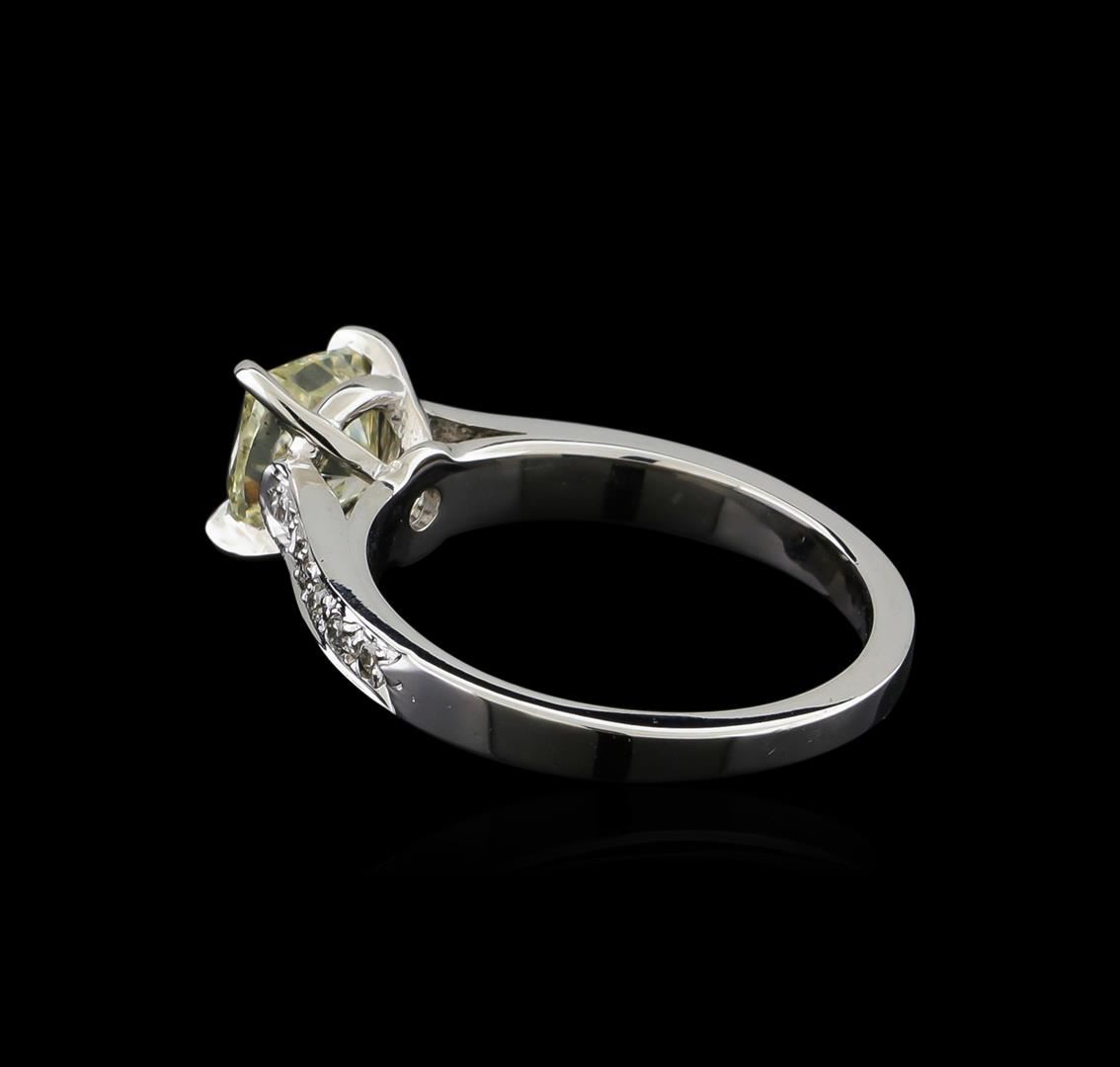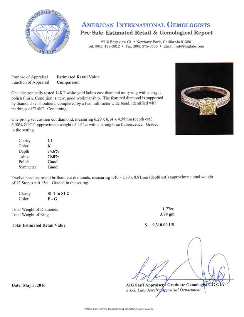 One electronically tested 14KT white gold ladies cast diamond unity ring with a bright polish finish. The featured diamond is supported by diamond set shoulders, completed by a two millimeter wide band. Identified with markings of "14K". Condition is new, good workmanship. Containing: One prong set cushion cut diamond, measuring 6.29 x 6.14 x 4.58mm (depth est.), 6.00.%. GTCF approximate weight of 1.62ct with a strong blue fluorescence. Graded in the setting. Clarity: I-1. Color: 74.6%. Table 70.0%. Twelve bead set round brilliant cut diamonds, measuring 1.40 - 1.30 x 0.81mm (depth est.) approximate total weight of 12 Stones = 0.15ct. Graded in the setting. Clarity: SI-1 to SI-2. Color: F - G. Total Weight of Diamonds 1.77ct. Total Weight of Ring 3.79gm. AIG Appraised at $9,310.00.