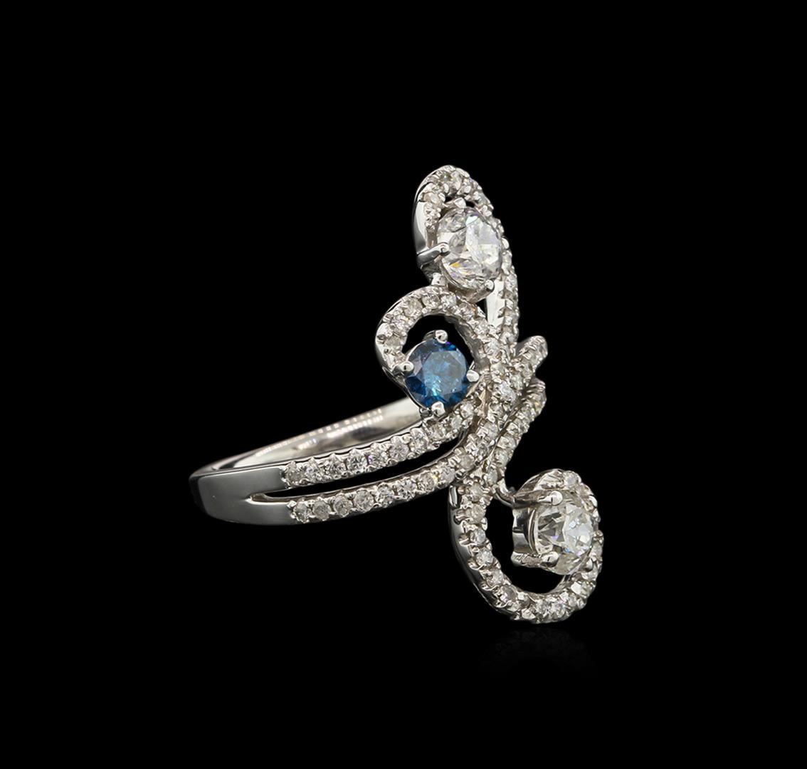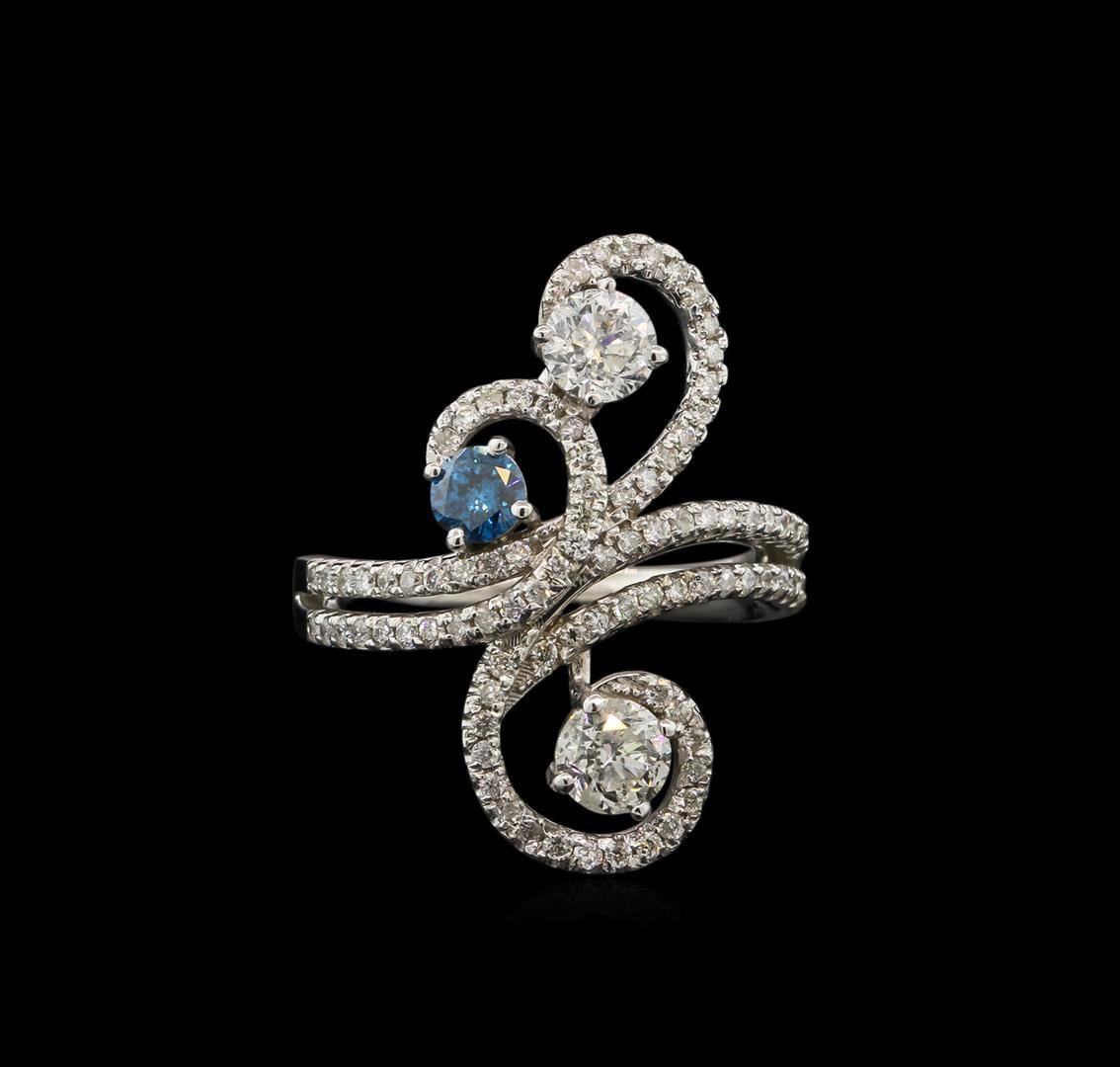 One electronically tested 14KT white gold ladies cast diamond ring with a bright polish finish. The ring features swirling diamond ribbons supported by diamond set split shoulders, completed by a two millimeter wide band. Identified with markings of "585". Condition is new, good workmanship. Containing: One prong set round brilliant cut diamond, measuring 3.95 - 3.90 x 2.36mm exact weight 0.22ct. Indications of laboratory irradiated enhanced color. Graded in the setting. Clarity: I-1 Two prong set round brilliant cut diamonds, measuring 4.80 - 4.80 x 2.88mm exact total weight 2 Stones = 1.00ct. Graded in the setting. Clarity: I-1. Color: G - H Eighty-Eight prong set round brilliant cut diamonds exact total weight 88 Stones = 0.55ct. Graded in the setting. Clarity: SI-2 to I-1. Color: G - I. Total Weight of Diamonds 1.77ct. Total Weight of Ring 5.72gm. AIG Appraised at $9,120.00.