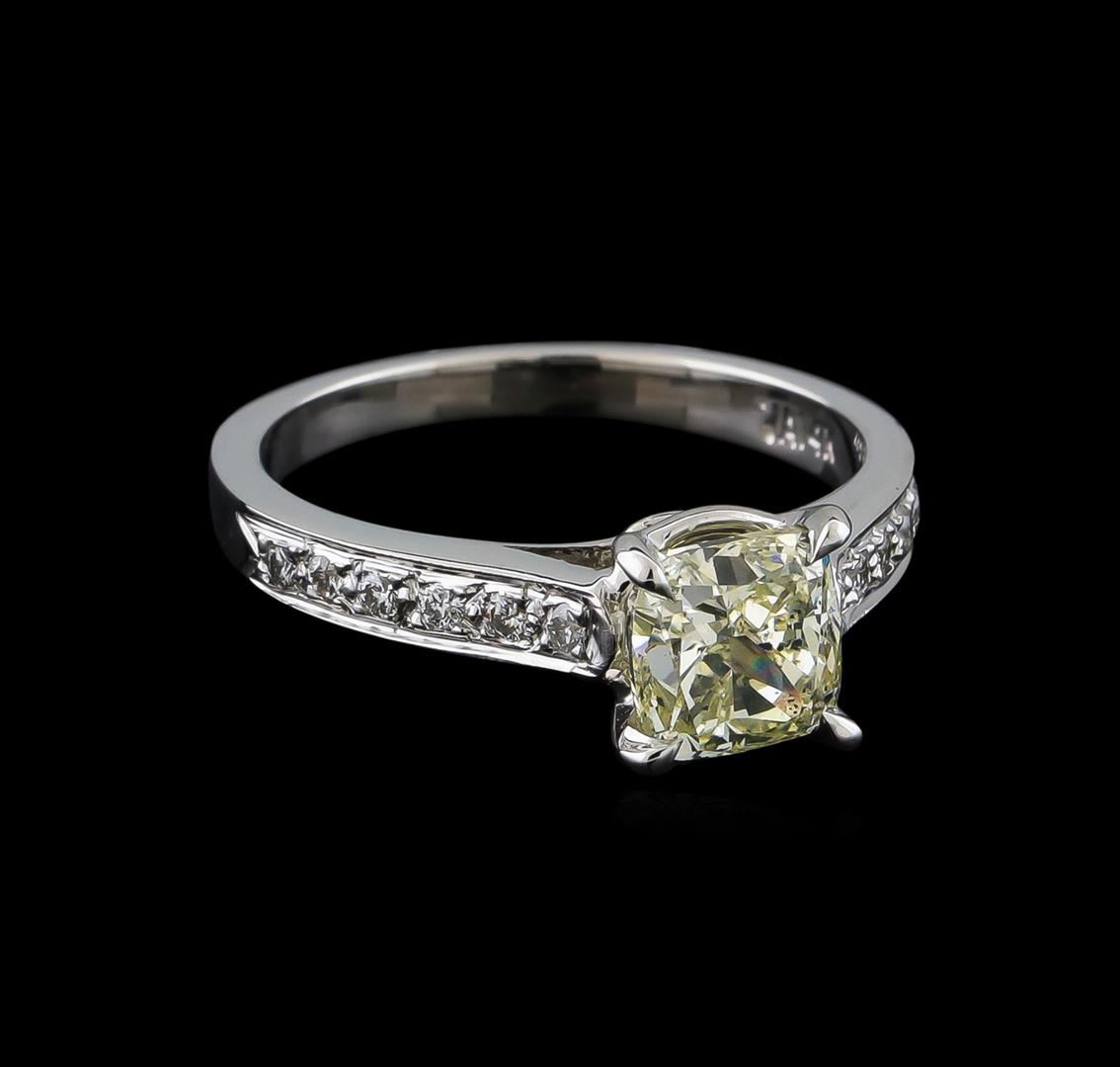 One electronically tested 14KT white gold ladies cast diamond unity ring with a bright polish finish. The featured diamond is supported by diamond set shoulders, completed by a two millimeter wide band. Identified with markings of "14K". Condition is new, good workmanship. Containing: One prong set cushion cut diamond, measuring 6.29 x 6.14 x 4.58mm (depth est.), 6.00.%. GTCF approximate weight of 1.62ct with a strong blue fluorescence. Graded in the setting. Clarity: I-1. Color: 74.6%. Table 70.0%. Twelve bead set round brilliant cut diamonds, measuring 1.40 - 1.30 x 0.81mm (depth est.) approximate total weight of 12 Stones = 0.15ct. Graded in the setting. Clarity: SI-1 to SI-2. Color: F - G. Total Weight of Diamonds 1.77ct. Total Weight of Ring 3.79gm. AIG Appraised at $9,310.00.