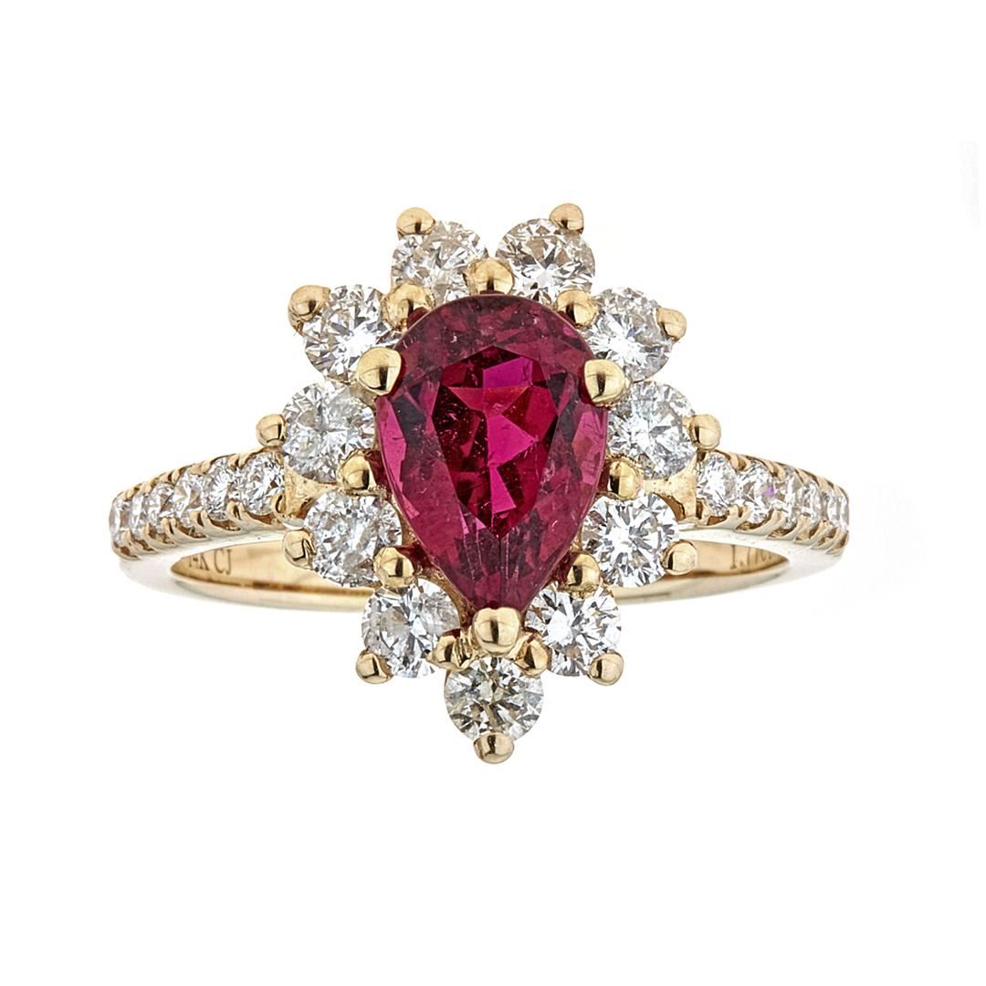 One Lady's Rubellite and Diamond Ring. Setting: 14 Kt. Yellow Gold Mounting. Additional: 23 Round Diamonds = 1.15 Cts. TWT (H-I/SI-I). Center Gem Stone Information: Species: Natural Tourmaline. Variety: Rubellite. Shape and Cut: Pear Mixed Cut. Measurements: 9.50 x 6.35 x 4.95 mm. Weight: 1.77 Carats. Transparency: Transparent. Color Hue: Purplish Red. Saturation: Moderately Strong. Total Weight: 3.6 grams.