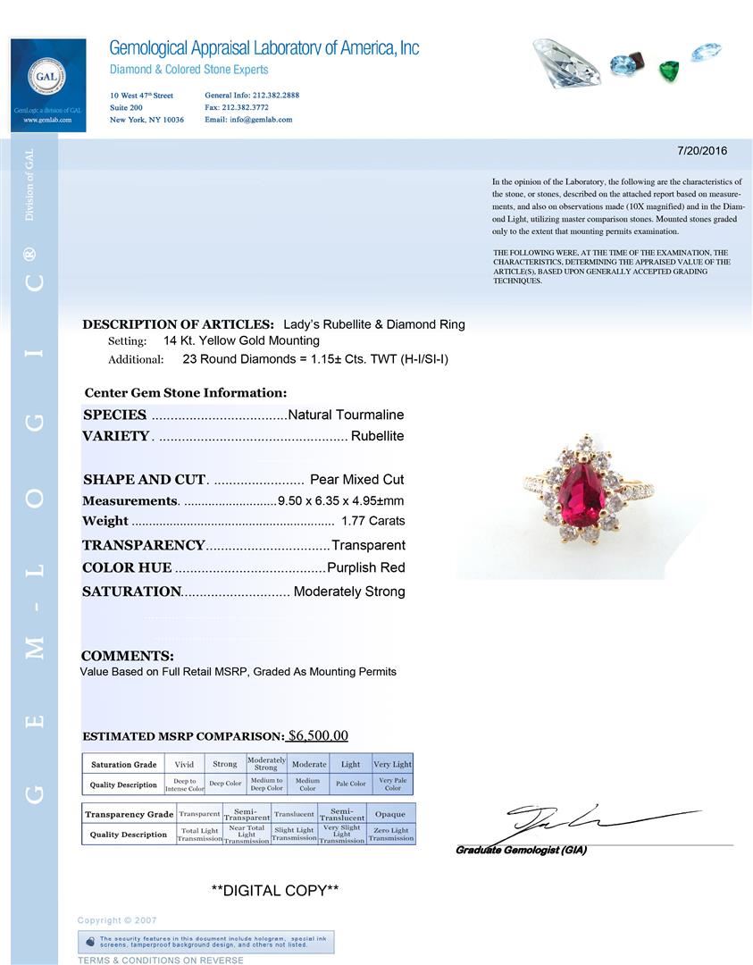 One Lady's Rubellite and Diamond Ring. Setting: 14 Kt. Yellow Gold Mounting. Additional: 23 Round Diamonds = 1.15 Cts. TWT (H-I/SI-I). Center Gem Stone Information: Species: Natural Tourmaline. Variety: Rubellite. Shape and Cut: Pear Mixed Cut. Measurements: 9.50 x 6.35 x 4.95 mm. Weight: 1.77 Carats. Transparency: Transparent. Color Hue: Purplish Red. Saturation: Moderately Strong. Total Weight: 3.6 grams.