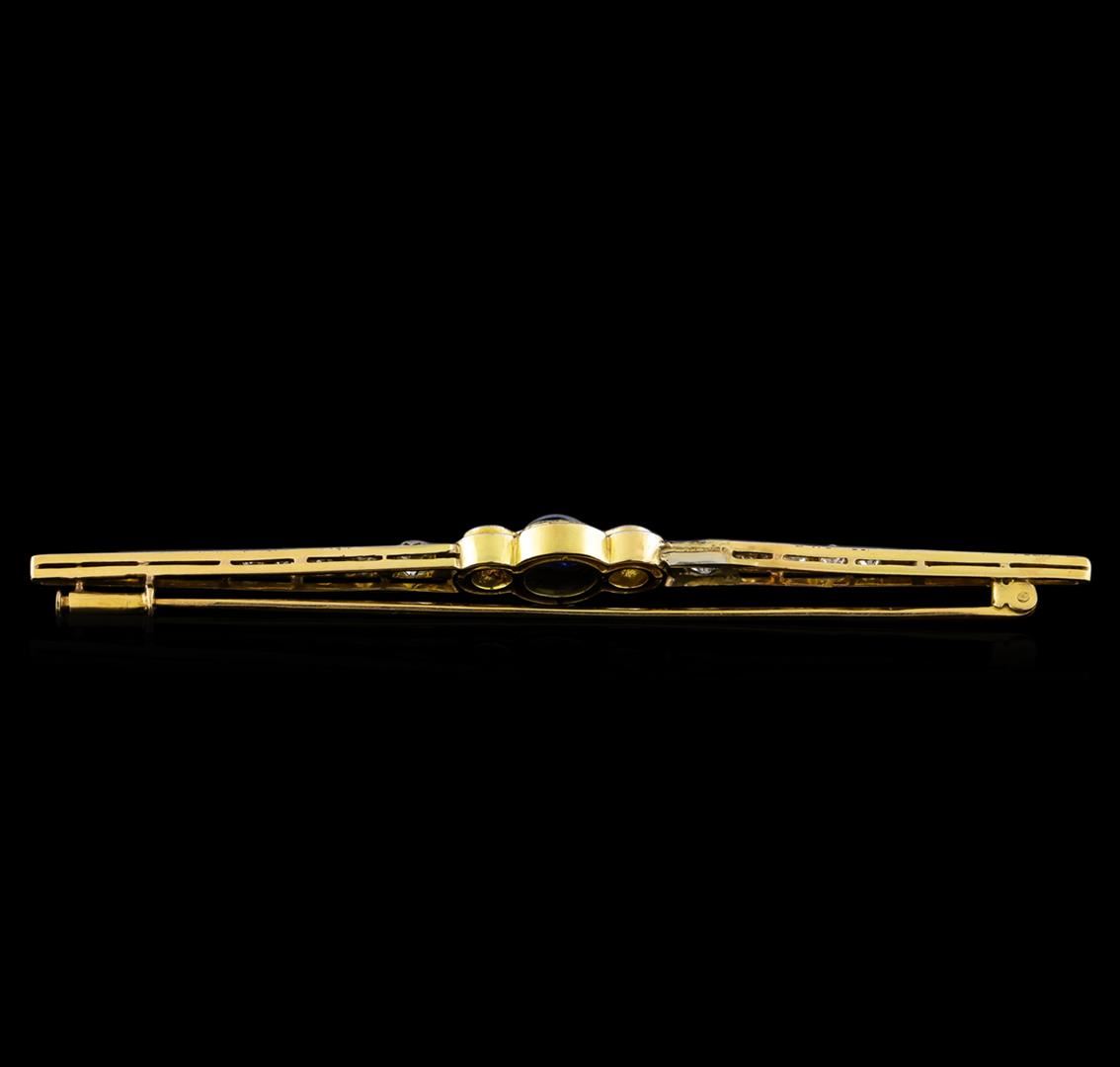 One electronically tested 14KT yellow and white gold ladies cast & assembled sapphire and diamond brooch. The three and one-half inch length brooch features a sapphire and diamond trio set within mirroring diamond ribbons, terminating in a horizontally/vertically placed pink. Bright polish finish with milgrain detailing. Condition is good. Containing: One bezel set round cabochon cut natural blue sapphire, measuring 6.60 x 6.50 x 3.60mm, approximate weight of 1.77ct., clarity is heavily included, type II, dark, very slightly grayish, blue color, (GIA B 7/3), cut is good. Transmitting light somewhat diffusely, transparent to translucent. Naturally occurring internal & external characteristics are present. Graded in the setting. Four prong & bezel set Old European cut diamonds, measuring 4.00 - 3.80 x 2.60mm (depth est.) approximate total weight of 4 Stones = 1.06ct. Cutting style circa early and late 19thcentury. The color grade reflects the entire range of color for this group. Graded in the setting. Clarity: SI-1 to SI-2. Color: G - K Two bead set Old European cut diamonds, measuring 3.10 - 3.00 x 1.90mm (depth est.) approximate total weight of 2 Stones = 0.24ct. Cutting style circa late 19th century. Graded in the setting. Clarity: SI-2. Color: H Six bead set Old European cut diamonds, measuring 2.50 - 2.10 x 1.50mm (depth est.) approximate total weight of 6 Stones = 0.35ct. Cutting style circa early and late 19th century. Graded in the setting. Clarity: SI-2 to I-1. Color: H - J. Total Weight of Colored Stones 1.77ct. Total Weight of Diamonds 1.65ct. Total Weight of Brooch 8.03gm. AIG Appraised.