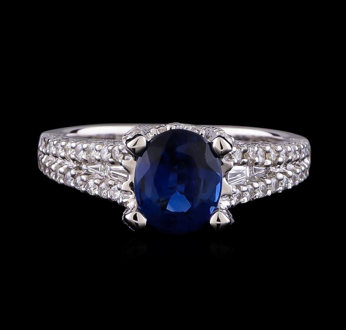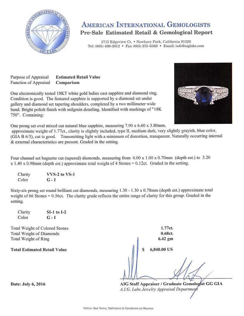 One electronically tested 18KT white gold ladies cast sapphire and diamond ring. The featured sapphire is supported by a diamond set under gallery and diamond set tapering shoulders, completed by a two millimeter wide band. Bright polish finish with milgrain detailing. Identified with markings of "18K 750". Condition is good. Containing: One prong set oval mixed cut natural blue sapphire, measuring 7.90 x 6.60 x 3.80mm, approximate weight of 1.77ct., clarity is slightly included, type II, medium dark, very slightly grayish, blue color, (GIA B 6/3), cut is good. Transmitting light with a minimum of distortion, transparent. Naturally occurring internal & external characteristics are present. Graded in the setting. Four channel set baguette cut (tapered) diamonds, measuring from 0.00 x 1.00 x 0.70mm (depth est.) to 3.20 x 1.40 x 0.98mm (depth est.) approximate total weight of 4 Stones = 0.12ct. Graded in the setting. Clarity: VVS-2 to VS-1. Color: G - I Sixty-Six prong set round brilliant cut diamonds, measuring 1.30 - 1.30 x 0.78mm (depth est.) approximate total weight of 66 Stones = 0.56ct. The clarity grade reflects the entire range of clarity for this group. Graded in the setting. Clarity: SI-1 to I-2. Color: G - I. Total Weight of Colored Stones 1.77ct. Total Weight of Diamonds 0.68ct. Total Weight of Ring 6.42gm. AIG Appraised at $6,840.00.
