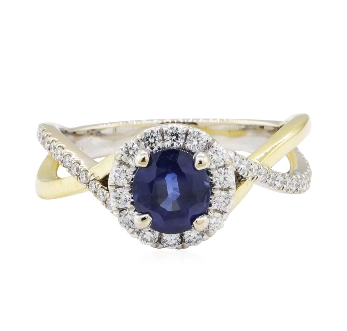 One electronically tested 18KT white gold lady's cast fashion ring with a crossover shank basket halo with a bright polish finish. The featured lady's ring has 18KT yellow gold plating and a shank measuring 2.40 millimeters wide. Identified with markings of '18K'. Condition is new, good workmanship. Containing: One prong set round modified mixed cut natural blue sapphire, measuring 6.50 - 5.85 x 3.98 mm, (depth est.) approximate weight of 1.34ct., clarity is slightly included, medium dark, moderately strong, blue color, (GIA B 6/4), cut is very good. Transmitting light with a minimum of distortion, transparent. Colored gemstones are presumed to have been subjected to commonly used enhancement processes. Graded in the setting. Fourteen prong set round brilliant cut diamonds, measuring 1.60 - 1.55 x 0.98mm (depth est.) approximate total weight of 14 Stones = 0.22ct. Graded in the setting. Color G - H Clarity VS-1 to VS-2 Cut Very Good Thirty-Four prong set round brilliant cut diamonds, measuring 1.20 - 1.15 x 0.73mm (depth est.) approximate total weight of 34 Stones = 0.21ct. Graded in the setting. Color G - H Clarity VS-2 to SI-1 Cut Very Good. Total Weight of Colored Stones 1.34ct.. Total Weight of Diamonds 0.43ct.. Total Weight of Ring 4.90gm GAS Appraised at $5250.00. GAS Appraised at $5,250.00.