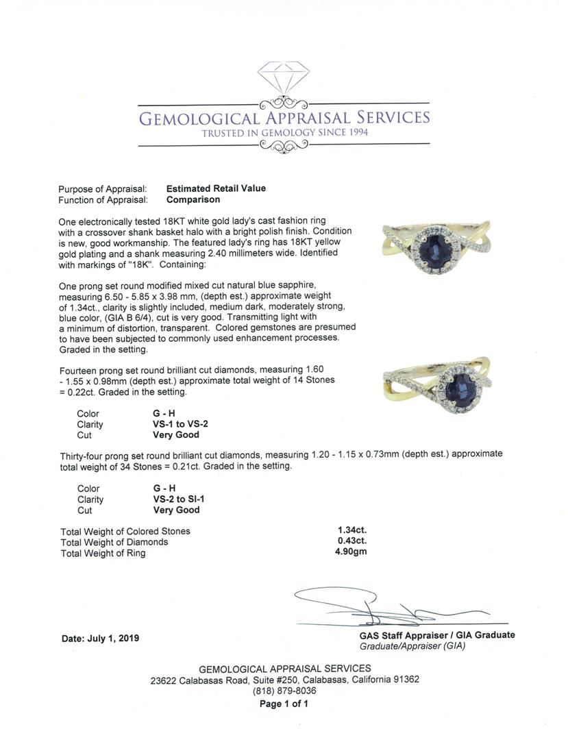 One electronically tested 18KT white gold lady's cast fashion ring with a crossover shank basket halo with a bright polish finish. The featured lady's ring has 18KT yellow gold plating and a shank measuring 2.40 millimeters wide. Identified with markings of '18K'. Condition is new, good workmanship. Containing: One prong set round modified mixed cut natural blue sapphire, measuring 6.50 - 5.85 x 3.98 mm, (depth est.) approximate weight of 1.34ct., clarity is slightly included, medium dark, moderately strong, blue color, (GIA B 6/4), cut is very good. Transmitting light with a minimum of distortion, transparent. Colored gemstones are presumed to have been subjected to commonly used enhancement processes. Graded in the setting. Fourteen prong set round brilliant cut diamonds, measuring 1.60 - 1.55 x 0.98mm (depth est.) approximate total weight of 14 Stones = 0.22ct. Graded in the setting. Color G - H Clarity VS-1 to VS-2 Cut Very Good Thirty-Four prong set round brilliant cut diamonds, measuring 1.20 - 1.15 x 0.73mm (depth est.) approximate total weight of 34 Stones = 0.21ct. Graded in the setting. Color G - H Clarity VS-2 to SI-1 Cut Very Good. Total Weight of Colored Stones 1.34ct.. Total Weight of Diamonds 0.43ct.. Total Weight of Ring 4.90gm GAS Appraised at $5250.00. GAS Appraised at $5,250.00.