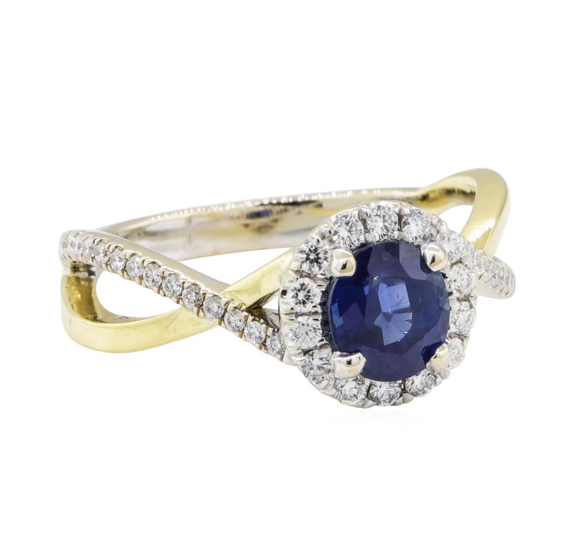 One electronically tested 18KT white gold lady's cast fashion ring with a crossover shank basket halo with a bright polish finish. The featured lady's ring has 18KT yellow gold plating and a shank measuring 2.40 millimeters wide. Identified with markings of '18K'. Condition is new, good workmanship. Containing: One prong set round modified mixed cut natural blue sapphire, measuring 6.50 - 5.85 x 3.98 mm, (depth est.) approximate weight of 1.34ct., clarity is slightly included, medium dark, moderately strong, blue color, (GIA B 6/4), cut is very good. Transmitting light with a minimum of distortion, transparent. Colored gemstones are presumed to have been subjected to commonly used enhancement processes. Graded in the setting. Fourteen prong set round brilliant cut diamonds, measuring 1.60 - 1.55 x 0.98mm (depth est.) approximate total weight of 14 Stones = 0.22ct. Graded in the setting. Color G - H Clarity VS-1 to VS-2 Cut Very Good Thirty-Four prong set round brilliant cut diamonds, measuring 1.20 - 1.15 x 0.73mm (depth est.) approximate total weight of 34 Stones = 0.21ct. Graded in the setting. Color G - H Clarity VS-2 to SI-1 Cut Very Good. Total Weight of Colored Stones 1.34ct.. Total Weight of Diamonds 0.43ct.. Total Weight of Ring 4.90gm GAS Appraised at $5250.00. GAS Appraised at $5,250.00.