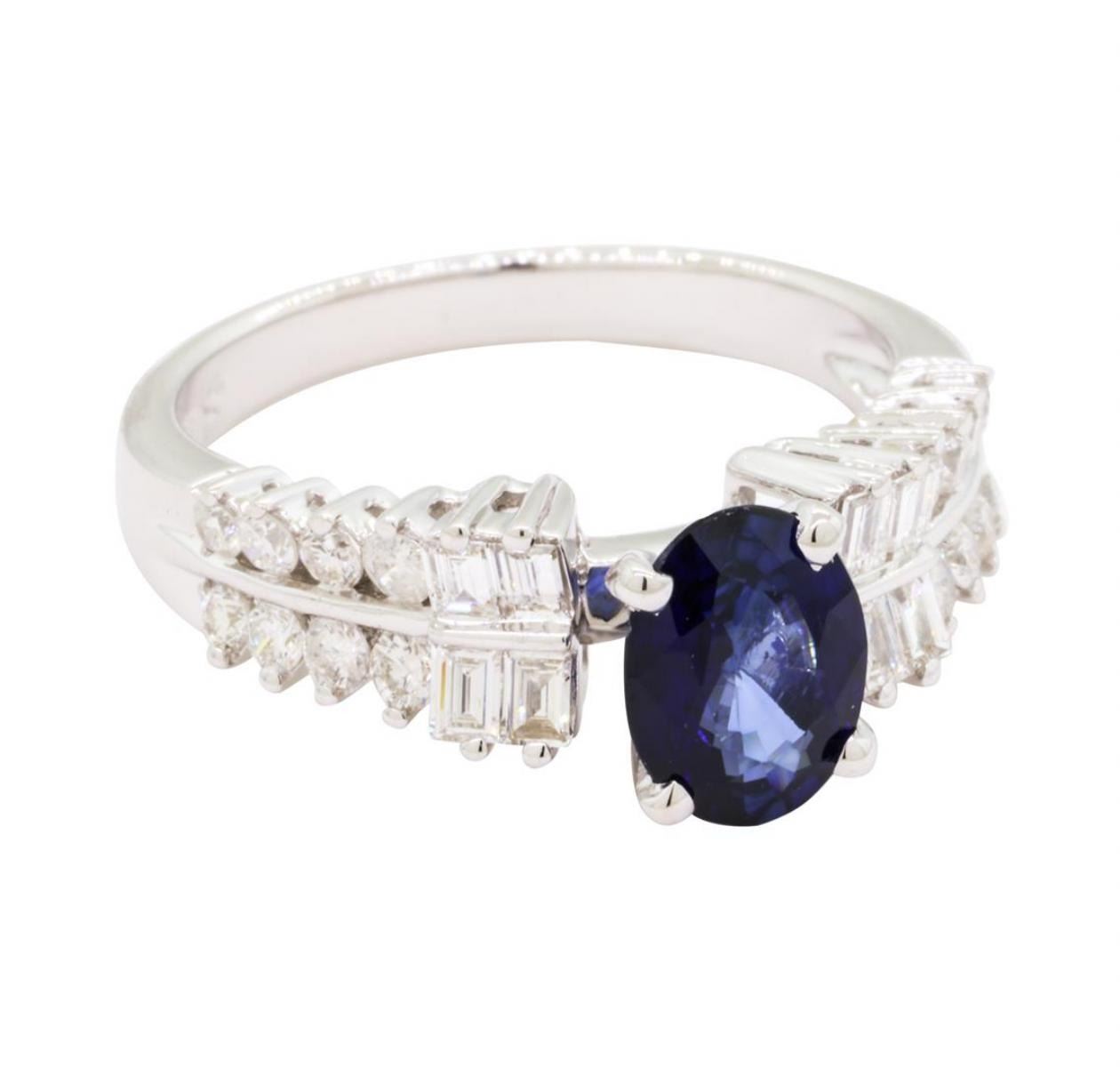 One electronically tested 18KT white gold lady's combination cast & assembled fashion ring with a tapered cathedral shank with a bright polish finish. The featured lady's ring has a shank measuring 2.40 millimeters wide. Identified with markings of '750'. Condition is new, good workmanship. Containing: One prong set oval modified mixed cut natural blue sapphire, measuring 7.95 x 6.03 x 3.40mm, (depth est.) approximate weight of 1.37ct., clarity is eye clean, medium dark, very slightly grayish, blue color, (GIA B 6/3), cut is good. Transmitting light with no distortion, transparent. Colored gemstones are presumed to have been subjected to commonly used enhancement processes. Graded in the setting. Eight channel and prong set baguette cut diamonds, measuring from 2.25 x 1.60 x 1.36mm (depth est.) to 2.30 x 1.75 x 1.49mm (depth est.) approximate total weight of 8 Stones = 0.40ct. Graded in the setting. Color H - I Clarity VS-1 to VS-2 Cut Very Good Sixteen channel and prong set round brilliant cut diamonds, measuring 1.60 - 1.40 x 0.90mm (depth est.) approximate total weight of 16 Stones = 0.19ct. Graded in the setting. Color H - I Clarity SI-1 to SI-2 Cut Good. Total Weight of Colored Stones 1.37ct.. Total Weight of Diamonds 0.59ct.. Total Weight of Ring 5.00gm GAS Appraised at $3640.00. GAS Appraised.