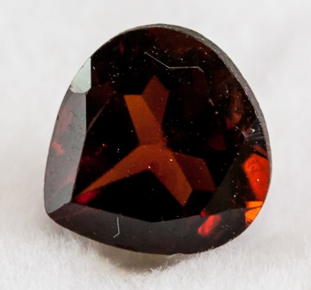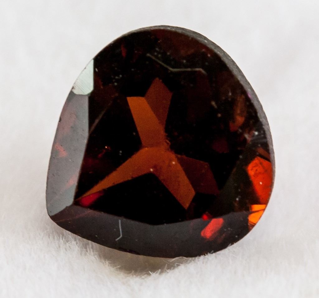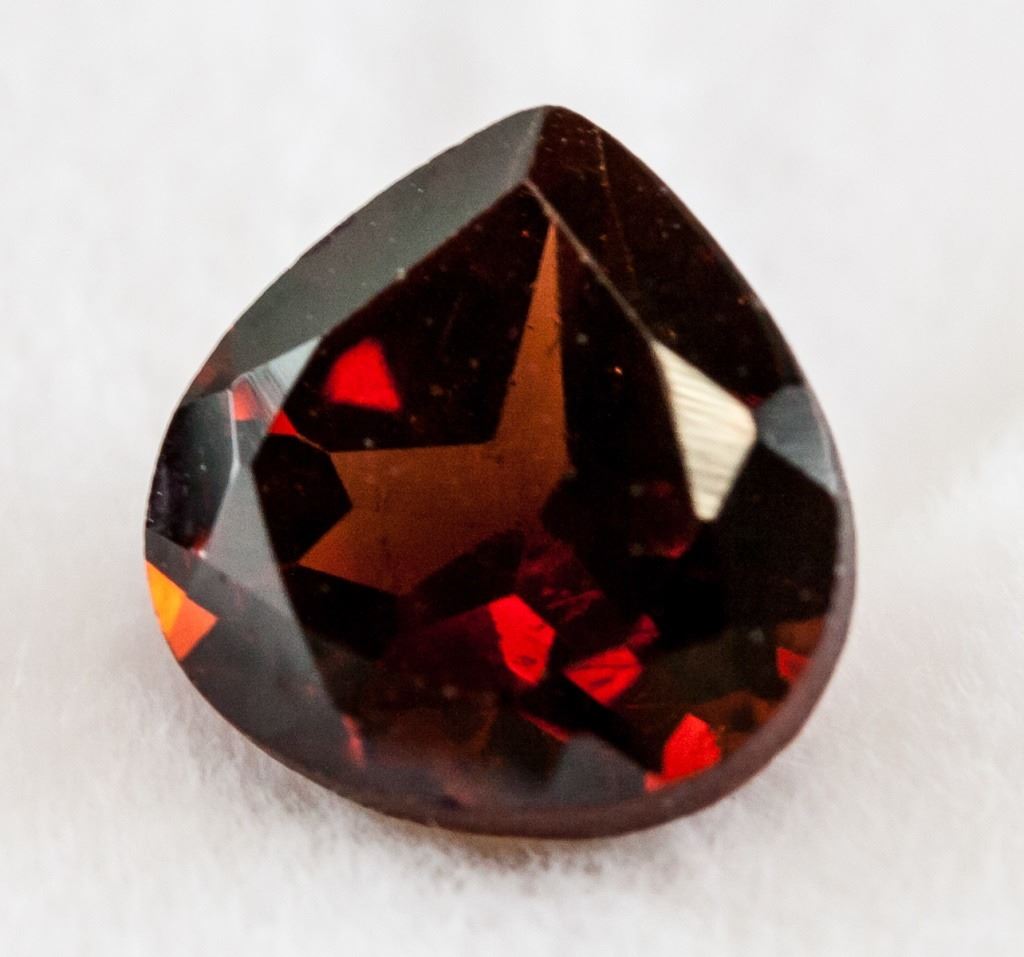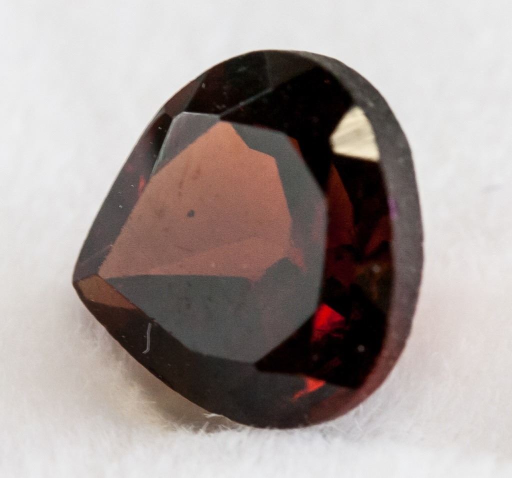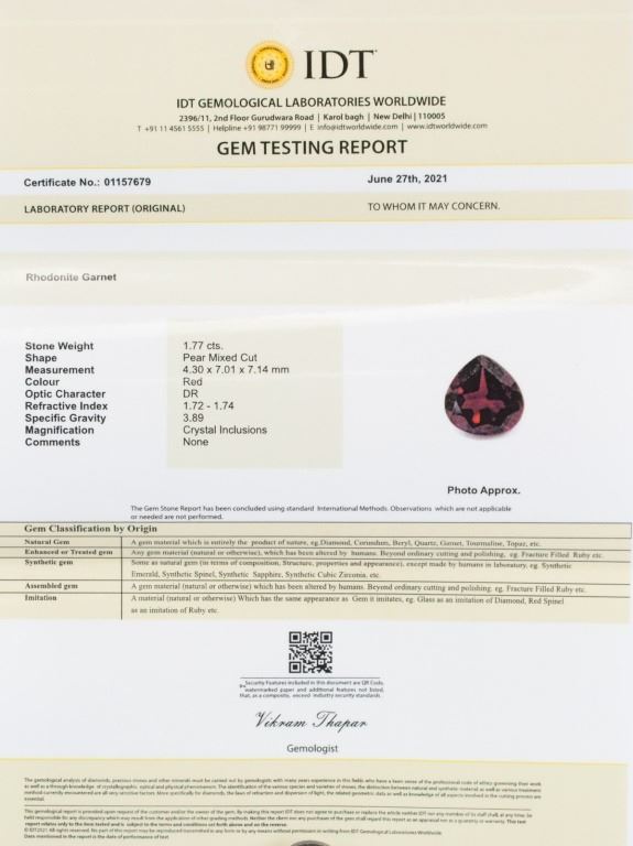 One (1) 1.77ct pear cut red rhodonite garnet. Accompanied with IDT certificate. 4.30 x 7.01 x 7.14 mm.