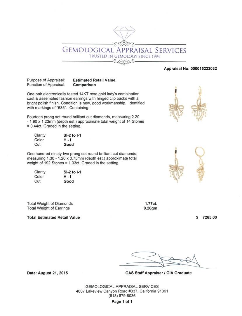 One pair electronically tested 14KT rose gold lady's combination cast & assembled fashion earrings with hinged clip backs with a bright polish finish. Identified with markings of "585". Condition is new, good workmanship. Containing: Fourteen prong set round brilliant cut diamonds, measuring 2.20 - 1.90 x 1.23mm (depth est.) approximate total weight of 14 Stones = 0.44ct. Graded in the setting. Clarity: SI-2 to I-1. Color: H - I. Cut Good One Hundred Ninety-Two prong set round brilliant cut diamonds, measuring 1.30 - 1.20 x 0.75mm (depth est.) approximate total weight of 192 Stones = 1.33ct. Graded in the setting. Clarity: SI-2 to I-1. Color: H - I. Cut Good. Total Weight of Diamonds 1.77ct. Total Weight of Earrings 9.20gm. GAS Appraised at $7,265.00.