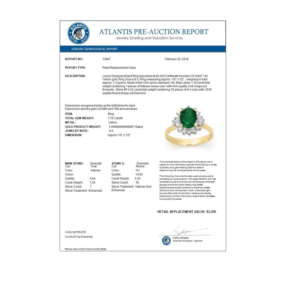 REF-46M5H -13647 ---- 1.78 CTW Emerald & Diamond Ring 14K Yellow Gold ---- Luxury Designer Brand Ring Appraised at $3,050 Certificate Number US13647  14k Yellow gold,  Ring Size is 6.5, Ring measuring approx. 1/2" x  1/2" , weighing in total approx. 3.3 grams. Made in the USA and is stamped 14k, Main stone 1.35 carat total weight containing 1 pieces of Intense Green color with AAA quality Oval shape cut Emerald , Stone #2 0.43 carat total weight containing 16 pieces of H-I color with  VS/SI quality Round shape cut Diamond