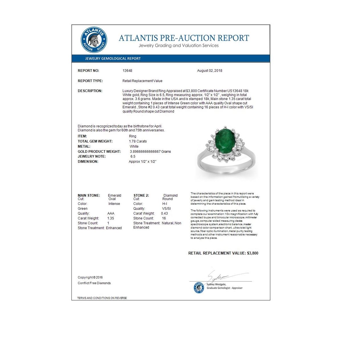 REF-57N3Y -13648 ---- 1.78 CTW Emerald & Diamond Ring 18K White Gold ---- Luxury Designer Brand Ring Appraised at $3,800 Certificate Number US13648 18k White gold, Ring Size is 6.5, Ring measuring approx. 1/2" x 1/2" , weighing in total approx. 3.6 grams. Made in the USA and is stamped 18k, Main stone 1.35 carat total weight containing 1 pieces of Intense Green color with AAA quality Oval shape cut Emerald , Stone #2 0.43 carat total weight containing 16 pieces of H-I color with VS/SI quality Round shape cut Diamond