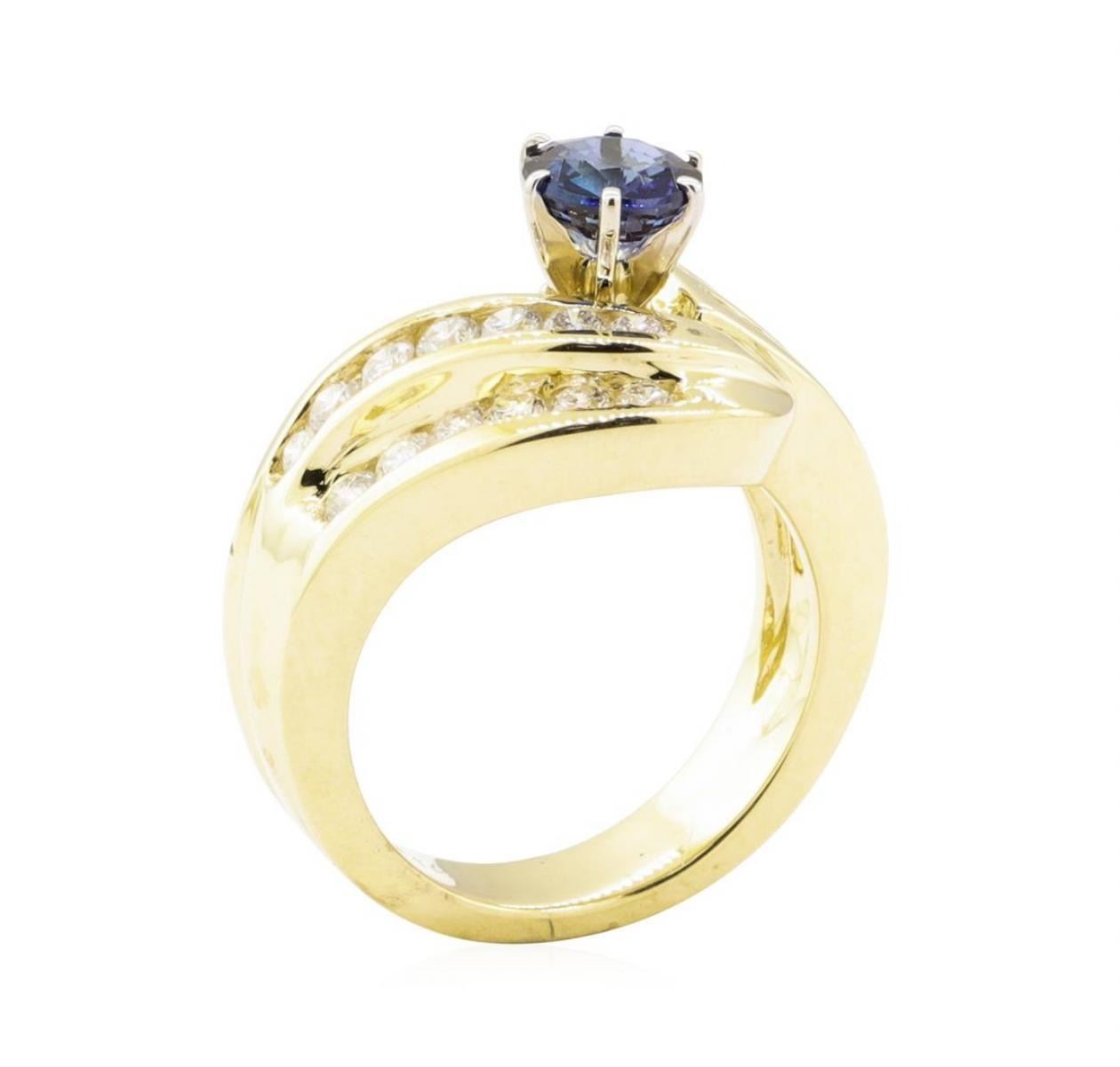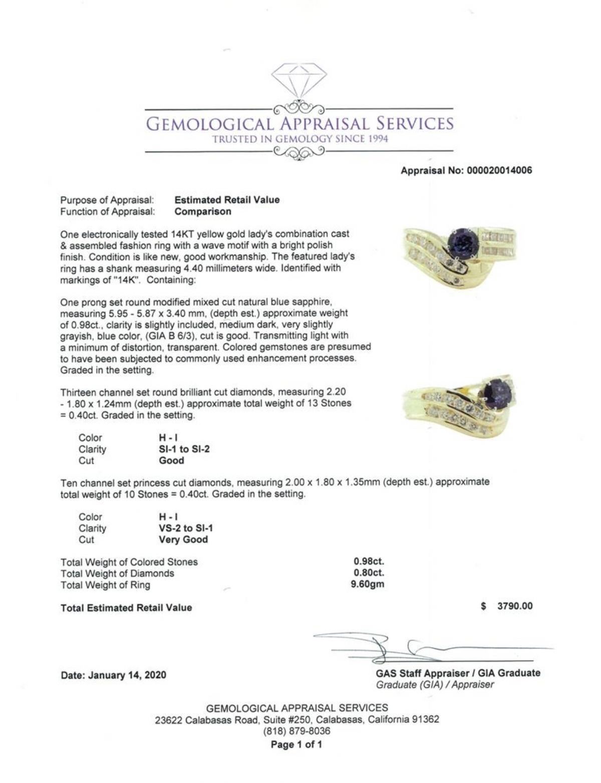 One electronically tested 14KT yellow gold lady's combination cast & assembled fashion ring with a wave motif with a bright polish finish. The featured lady's ring has a shank measuring 4.40 millimeters wide. Identified with markings of '14K'. Condition is like new, good workmanship. Containing: One prong set round modified mixed cut natural blue sapphire, measuring 5.95 - 5.87 x 3.40 mm, (depth est.) approximate weight of 0.98ct., clarity is slightly included, medium dark, very slightly grayish, blue color, (GIA B 6/3), cut is good. Transmitting light with a minimum of distortion, transparent. Colored gemstones are presumed to have been subjected to commonly used enhancement processes. Graded in the setting. Thirteen channel set round brilliant cut diamonds, measuring 2.20 - 1.80 x 1.24mm (depth est.) approximate total weight of 13 Stones = 0.40 ct. Graded in the setting. Color H - I Clarity SI-1 to SI-2 Cut Good Ten channel set princess cut diamonds, measuring 2.00 x 1.80 x 1.35mm (depth est.) approximate total weight of 10 Stones = 0.40 ct. Graded in the setting. Color H - I Clarity VS-2 to SI-1 Cut Very Good. Total Weight of Colored Stones 0.98ct.. Total Weight of Diamonds 0.80 ct.. Total Weight of Ring 9.60gm GAS Appraised at $3790.00. GAS Appraised.