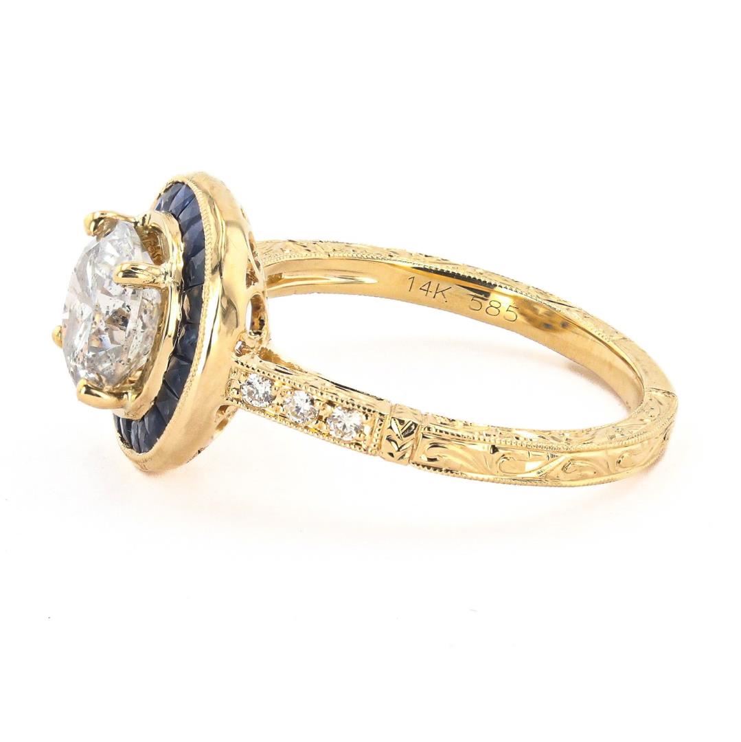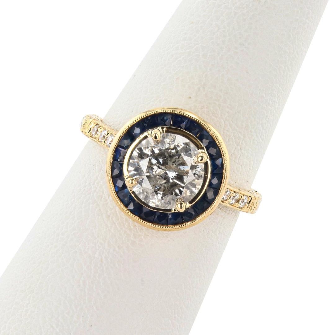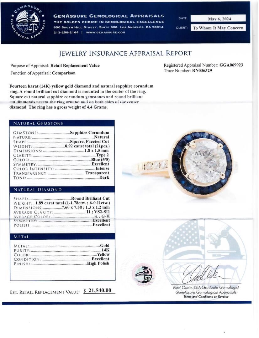 Fourteen karat (14K) yellow gold diamond and natural sapphire corundum ring. A round brilliant cut diamond is mounted in the center of the ring. Square cut natural sapphire corundum gemstones and round brilliant cut diamonds accent the ring around and on both sides of tire center diamond. The ring has a gross weight of 4.4 Grams. #NATURAL GEMSTONE# GEMSTONE: Sapphire Corundum NATURE: Natural SHAPE: Square, Faceted Cut WEIGHT: 0.92 carat total (21pcs.) DIMENSIONS: 1.8 x 1.5mm CLARITY: Type 2 COLOR: Blue (5/5) SYMMETRY: Excellent COLOR INTENSITY: Intense TRANSPARENCY: Transparent TONE: Dark #NATURAL DIAMOND# SHAPE: Round Brilliant Cut WEIGHT: 1.89 carat total (1-1.78ctw., 6-0.11ctw.) DIMENSIONS: 7.60 x 7.58, 1.3 x 1.2mm AVERAGE CLARITY: I1, VS2-SI1 AVERAGE COLOR: K, G-H SYMMETRY: Excellent POLISH: Excellent #METAL# METAL: Gold PURITY: 14K COLOR: Yellow CONDITION: Excellent FINISH: High Polish Size: 7