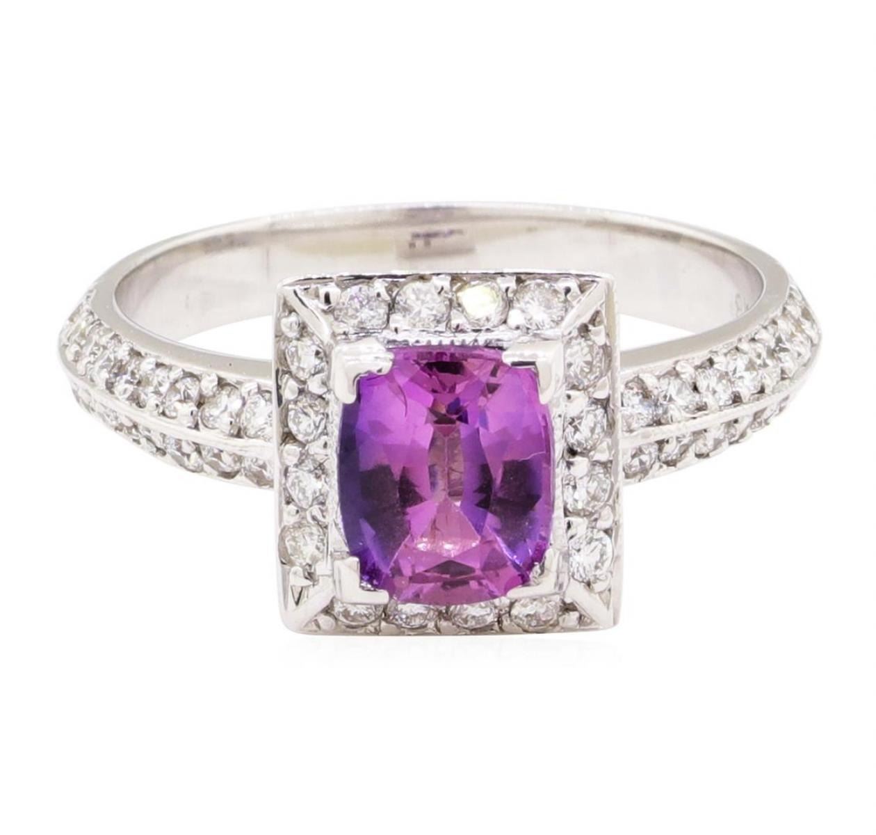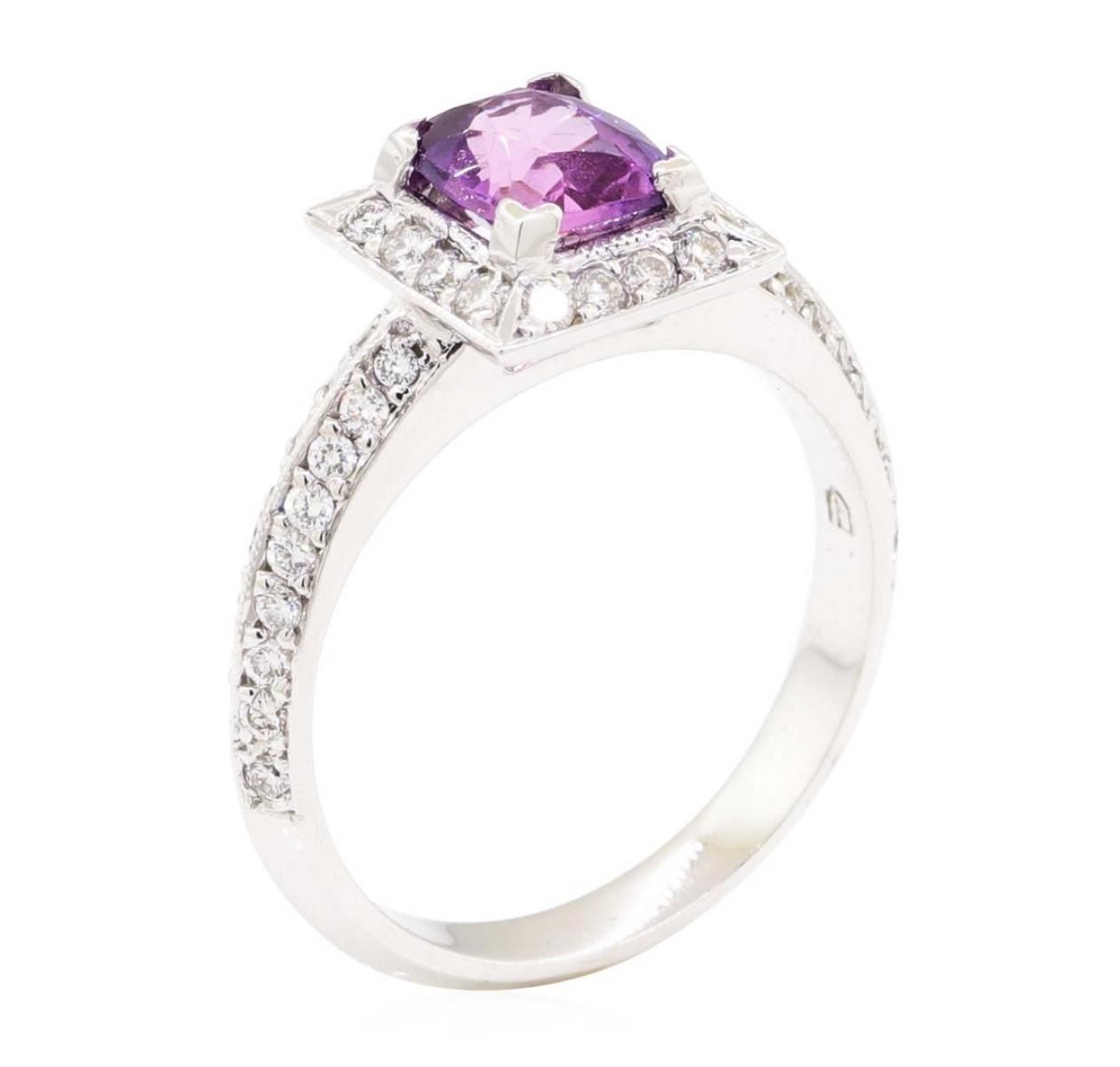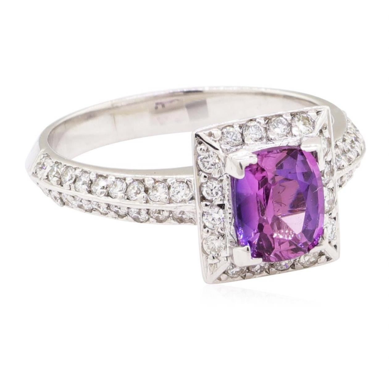 One electronically tested 18KT white gold lady's cast fashion ring with a knife edge cathedral shank with a bright polish finish. The featured lady's ring has a shank measuring 2.70 millimeters wide. Identified with markings of '18K'. Condition is new, good workmanship. Containing: One prong set rectangular cushion modified mixed cut natural purple sapphire, measuring 6.75 x 5.51 x 3.70mm, (depth est.) approximate weight of 1.30ct., clarity is eye clean, medium, strong, purple red color, (GIA PR 5/5), cut is good. Transmitting light with no distortion, transparent. Colored gemstones are presumed to have been subjected to commonly used enhancement processes. Graded in the setting. Sixteen prong set round brilliant cut diamonds, measuring 1.50 - 1.45 x 0.92mm (depth est.) approximate total weight of 16 Stones = 0.20ct. Graded in the setting. Color H - I Clarity SI-1 to SI-2 Cut Good Thirty-Six prong set round brilliant cut diamonds, measuring 1.30 - 1.25 x 0.79mm (depth est.) approximate total weight of 36 Stones = 0.28ct. Graded in the setting. Color H - I Clarity SI-1 to SI-2 Cut Good. Total Weight of Colored Stones 1.30ct.. Total Weight of Diamonds 0.48ct.. Total Weight of Ring 4.10gm GAS Appraised at $4620.00. GAS Appraised.