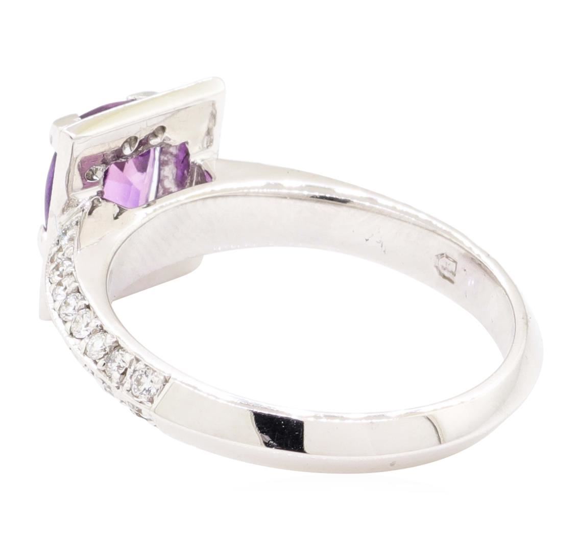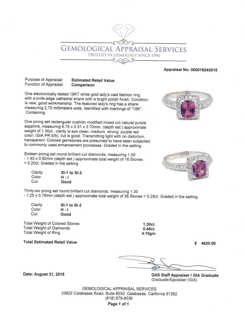 One electronically tested 18KT white gold lady's cast fashion ring with a knife edge cathedral shank with a bright polish finish. The featured lady's ring has a shank measuring 2.70 millimeters wide. Identified with markings of '18K'. Condition is new, good workmanship. Containing: One prong set rectangular cushion modified mixed cut natural purple sapphire, measuring 6.75 x 5.51 x 3.70mm, (depth est.) approximate weight of 1.30ct., clarity is eye clean, medium, strong, purple red color, (GIA PR 5/5), cut is good. Transmitting light with no distortion, transparent. Colored gemstones are presumed to have been subjected to commonly used enhancement processes. Graded in the setting. Sixteen prong set round brilliant cut diamonds, measuring 1.50 - 1.45 x 0.92mm (depth est.) approximate total weight of 16 Stones = 0.20ct. Graded in the setting. Color H - I Clarity SI-1 to SI-2 Cut Good Thirty-Six prong set round brilliant cut diamonds, measuring 1.30 - 1.25 x 0.79mm (depth est.) approximate total weight of 36 Stones = 0.28ct. Graded in the setting. Color H - I Clarity SI-1 to SI-2 Cut Good. Total Weight of Colored Stones 1.30ct.. Total Weight of Diamonds 0.48ct.. Total Weight of Ring 4.10gm GAS Appraised at $4620.00. GAS Appraised.