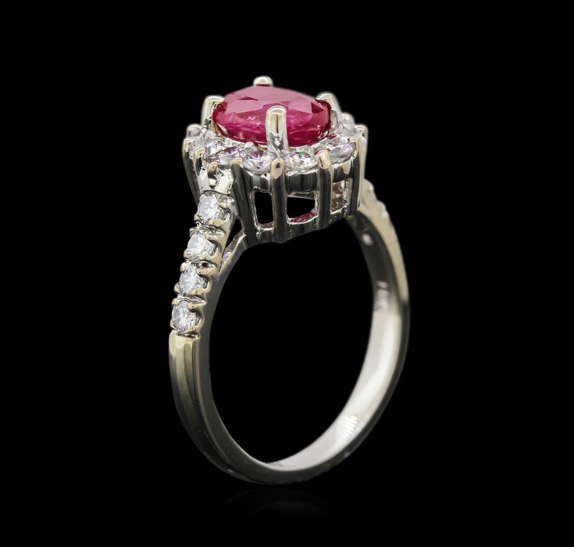 One ring featuring: 14KT white gold weighing 5.78 grams containing one prong set oval shape ruby center stone with a total weight of 1.78ct and 20 prong set round diamonds with a total weight of 0.84ct.