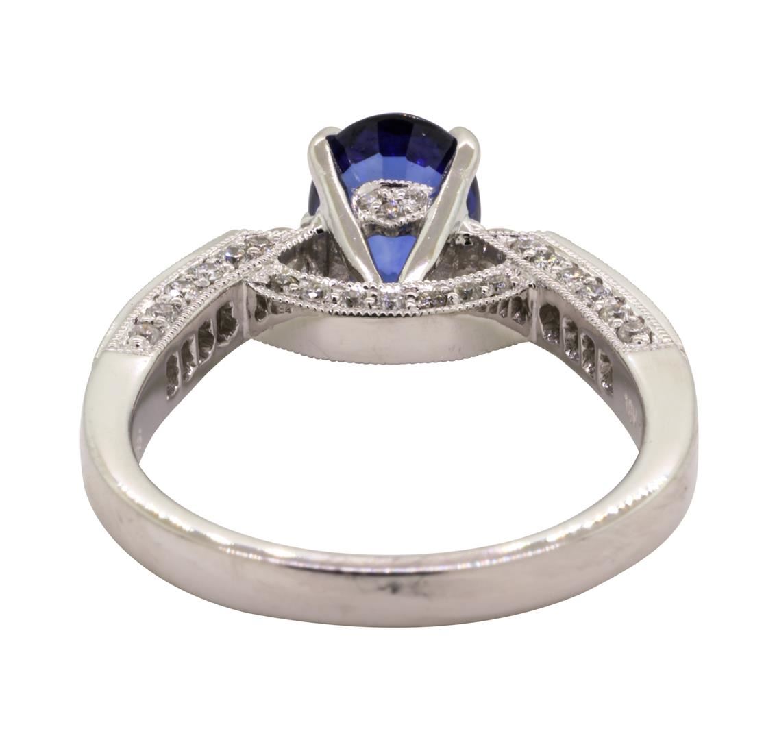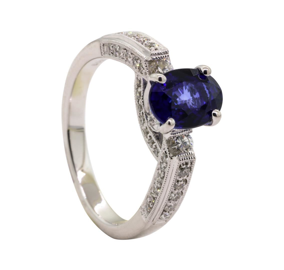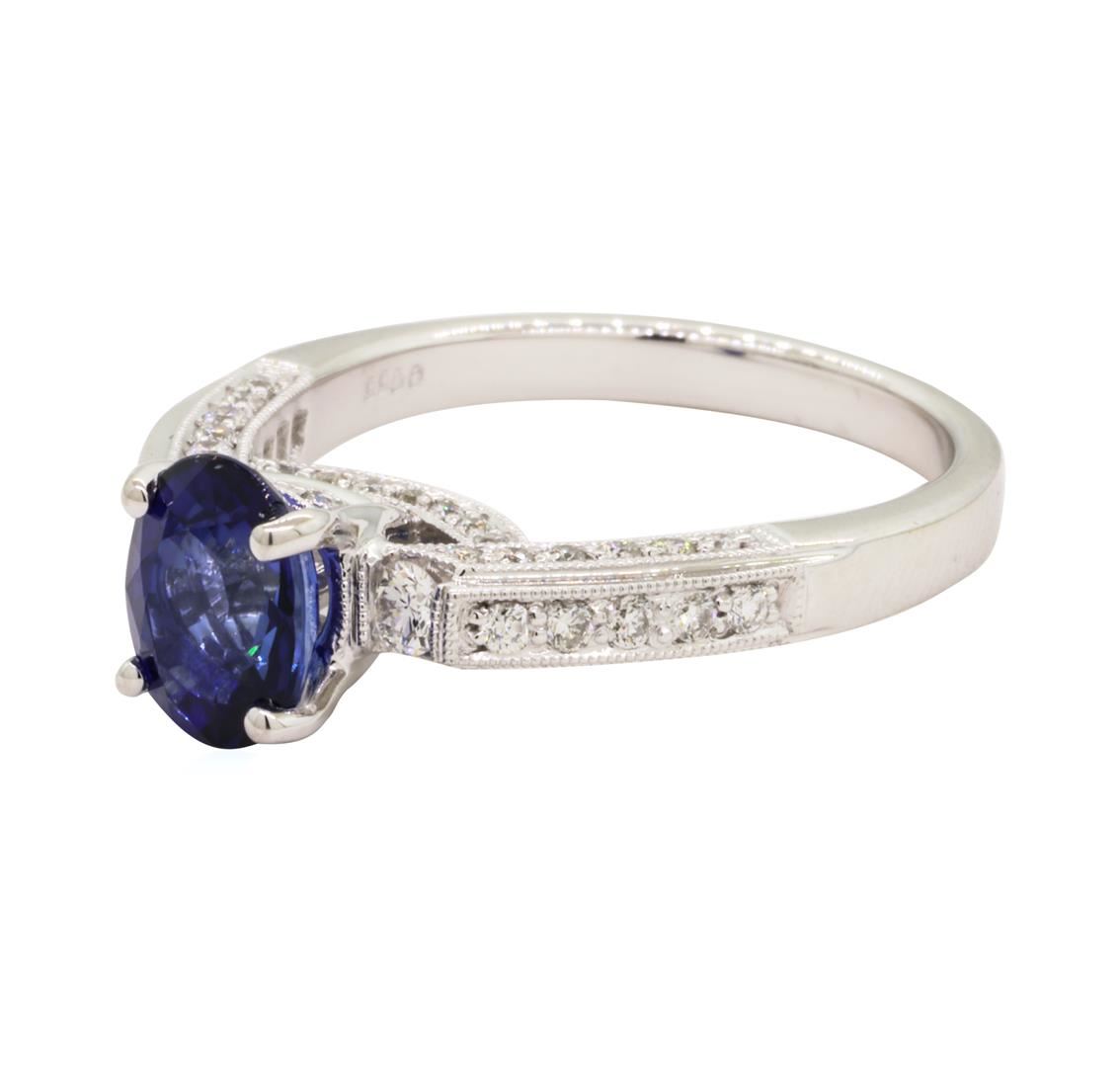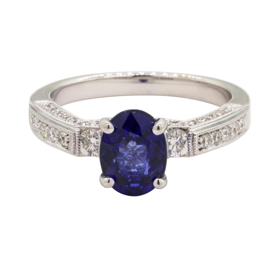 One lady's ring featuring: 18KT white gold weighing 5.7 grams containing one fine blue oval sapphire weighing 1.78ct and diamonds weighing 0.55ctw.