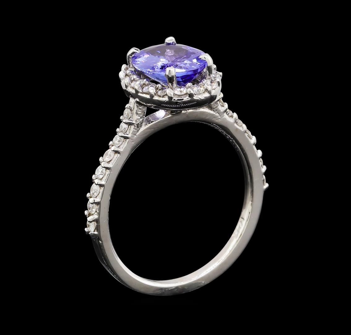 One electronically tested 14KT white gold lady's cast fashion ring with a cathedral shank with a basket halo with a bright polish finish. The featured lady's ring has a shank measuring 1.55 millimeters wide. Identified with markings of '14K'. Condition is new, good workmanship. Containing: One prong set oval modified brilliant cut natural tanzanite, measuring 9.53 x 7.44 x 3.77mm, (depth est.) approximate weight of 1.78ct., clarity is eye clean, medium, moderately strong, violetish blue color, (GIA vB 5/4), cut is very good. Transmitting light with no distortion, transparent. Colored gemstones are presumed to have been subjected to commonly used enhancement processes. Graded in the setting. Twenty-Eight prong set round brilliant cut diamonds, measuring 1.80 - 1.70 x 1.07mm (depth est.) approximate total weight of 28 Stones = 0.56ct. Graded in the setting. Clarity SI-1 to SI-2. Color: H - I Cut Good Four prong set round brilliant cut diamonds, measuring 1.40 - 1.35 x 0.86mm (depth est.) approximate total weight of 4 Stones = 0.04ct. Graded in the setting. Clarity SI-1 to I-1. Color: G - I Cut Good. Total Weight of Colored Stones 1.78ct.. Total Weight of Diamonds 0.60ct.. Total Weight of Ring 3.90gm. GAS Appraised at $4,520.00.