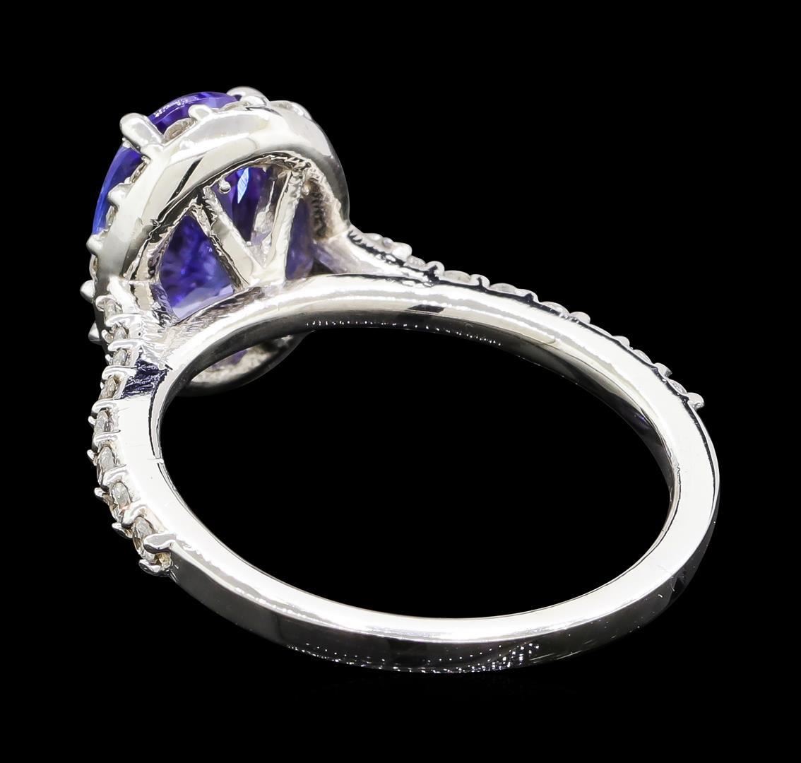 One electronically tested 14KT white gold lady's cast fashion ring with a cathedral shank with a basket halo with a bright polish finish. The featured lady's ring has a shank measuring 1.55 millimeters wide. Identified with markings of '14K'. Condition is new, good workmanship. Containing: One prong set oval modified brilliant cut natural tanzanite, measuring 9.53 x 7.44 x 3.77mm, (depth est.) approximate weight of 1.78ct., clarity is eye clean, medium, moderately strong, violetish blue color, (GIA vB 5/4), cut is very good. Transmitting light with no distortion, transparent. Colored gemstones are presumed to have been subjected to commonly used enhancement processes. Graded in the setting. Twenty-Eight prong set round brilliant cut diamonds, measuring 1.80 - 1.70 x 1.07mm (depth est.) approximate total weight of 28 Stones = 0.56ct. Graded in the setting. Clarity SI-1 to SI-2. Color: H - I Cut Good Four prong set round brilliant cut diamonds, measuring 1.40 - 1.35 x 0.86mm (depth est.) approximate total weight of 4 Stones = 0.04ct. Graded in the setting. Clarity SI-1 to I-1. Color: G - I Cut Good. Total Weight of Colored Stones 1.78ct.. Total Weight of Diamonds 0.60 ct.. Total Weight of Ring 3.90gm. GAS Appraised.