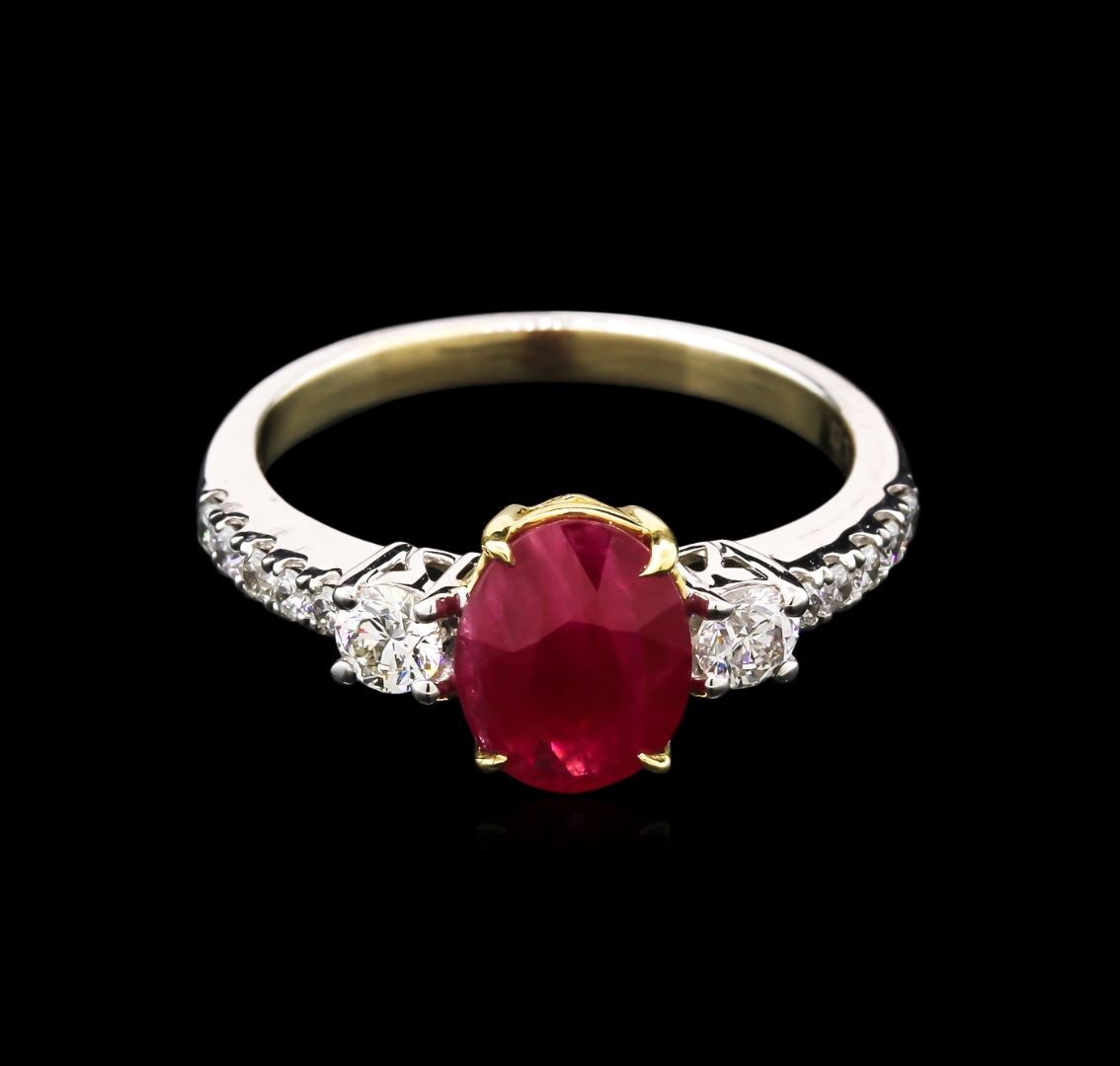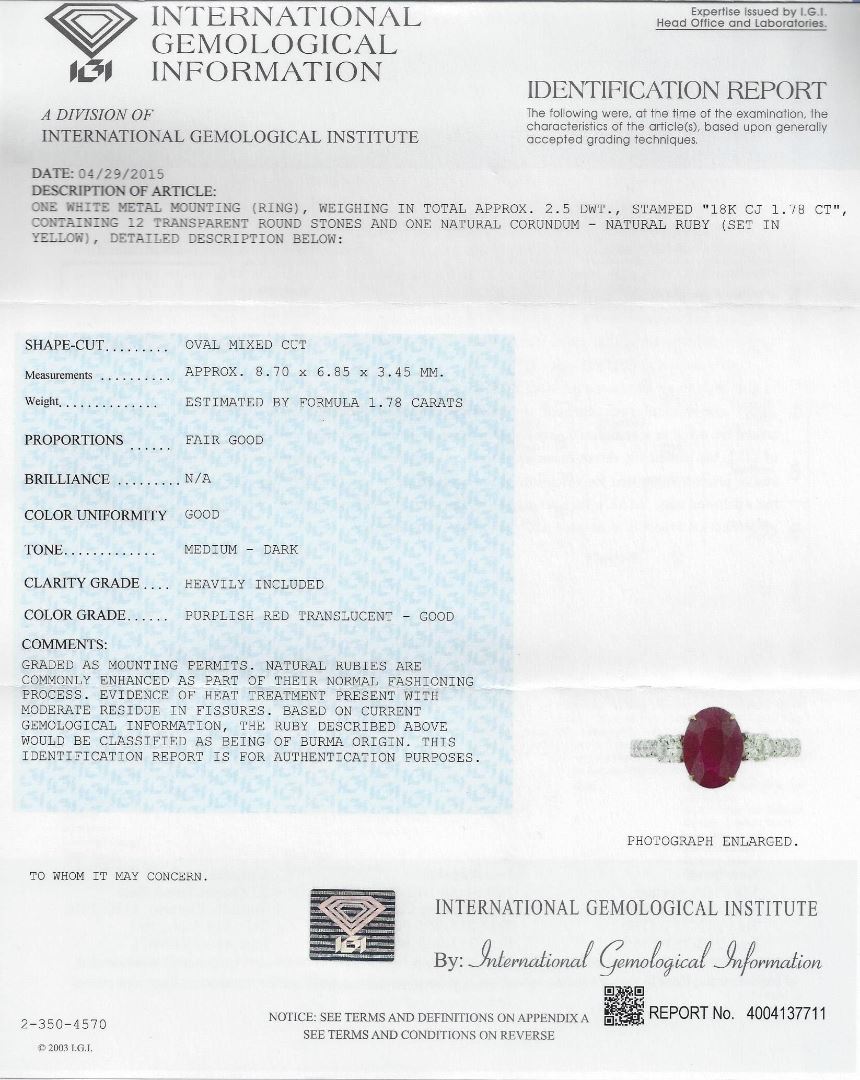 One white metal mounting (ring), weighing in total approx. 2.5 DWT., stamped "18K CJ 1.78 CT", containing 12 transparent round stones and one natural corundum - natural ruby (set in yellow), detailed description below: Shape-cut: oval mixed cut. Measurements: Approx. 8.70 x 6.85 x 3.45 mm. Weight: Estimated by formula 1.78 carats. Proportions: Fair - good. Brilliance: n/a. Color uniformity: Good. Tone: Medium - dark. Clarity grade: Heavily included. Color grade: Purplish red translucent - good. Comments: Graded as mounting permits. Natural rubies are commonly enhanced as part of their normal fashioning process. Evidence of heat treatment present with moderate residue in fissures. Based on current gemological information, the ruby described above would be classified as being of Burma origin. This identification report is for authentication purposes. IGI Appraised.