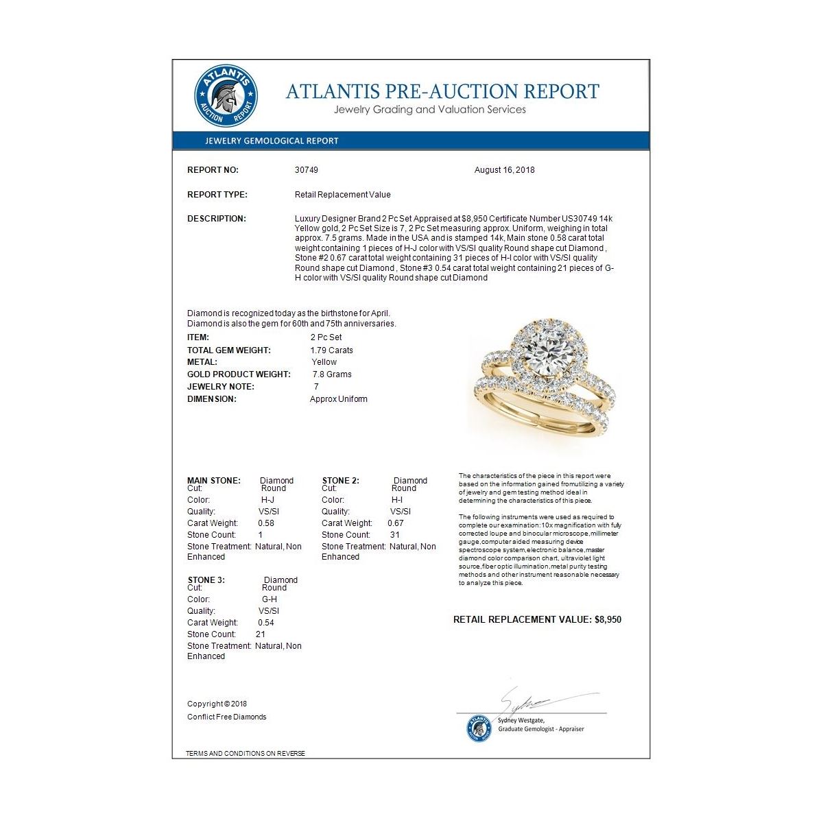 REF-180A8X -30749 ---- 1.79 CTW Certified VS/SI Diamond 2Pc Wedding Set Solitaire Halo 14K Yellow Gold ---- Luxury Designer Brand 2 Pc Set Appraised at $8,950 Certificate Number US30749 14k Yellow gold, 2 Pc Set Size is 7, 2 Pc Set measuring approx. Uniform, weighing in total approx. 7.5 grams. Made in the USA and is stamped 14k, Main stone 0.58 carat total weight containing 1 pieces of H-J color with VS/SI quality Round shape cut Diamond , Stone #2 0.67 carat total weight containing 31 pieces of H-I color with VS/SI quality Round shape cut Diamond , Stone #3 0.54 carat total weight containing 21 pieces of G-H color with VS/SI quality Round shape cut Diamond