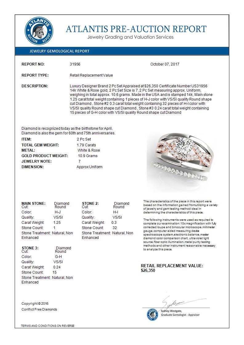 31956 - REF-532R4K ---- 1.79 CTW Certified VS/SI Diamond Solitaire 2Pc Set 14K White & Rose Gold ---- Luxury Designer Brand 2 Pc Set Appraised at $26,350 Certificate Number US31956 14k White & Rose gold, 2 Pc Set Size is 7, 2 Pc Set measuring approx. Uniform, weighing in total approx. 10.6 grams. Made in the USA and is stamped 14k, Main stone 1.25 carat total weight containing 1 pieces of H-J color with VS/SI quality Round shape cut Diamond , Stone #2 0.3 carat total weight containing 32 pieces of H-I color with VS/SI quality Round shape cut Diamond , Stone #3 0.24 carat total weight containing 15 pieces of G-H color with VS/SI quality Round shape cut Diamond
