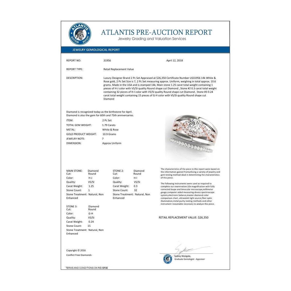 REF-532T4M -31956 ---- 1.79 CTW Certified VS/SI Diamond Solitaire 2Pc Set 14K White & Rose Gold ---- Luxury Designer Brand 2 Pc Set Appraised at $26,350 Certificate Number US31956 14k White & Rose gold, 2 Pc Set Size is 7, 2 Pc Set measuring approx. Uniform, weighing in total approx. 10.6 grams. Made in the USA and is stamped 14k, Main stone 1.25 carat total weight containing 1 pieces of H-J color with VS/SI quality Round shape cut Diamond , Stone #2 0.3 carat total weight containing 32 pieces of H-I color with VS/SI quality Round shape cut Diamond , Stone #3 0.24 carat total weight containing 15 pieces of G-H color with VS/SI quality Round shape cut Diamond