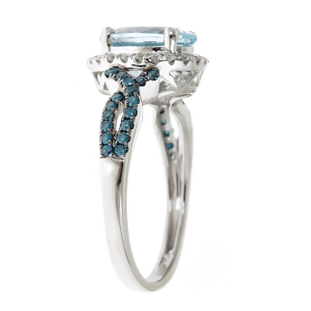 One Aquamarine and Diamond Ring featuring: 14KT White Gold with a total weight of 2.72 grams, Aquamarine with a total weight of 1.79ct, 34 Blue Diamonds with a total weight of 0.25ctw, and 22 Round Cut Diamonds with a total weight of 0.17ctw.