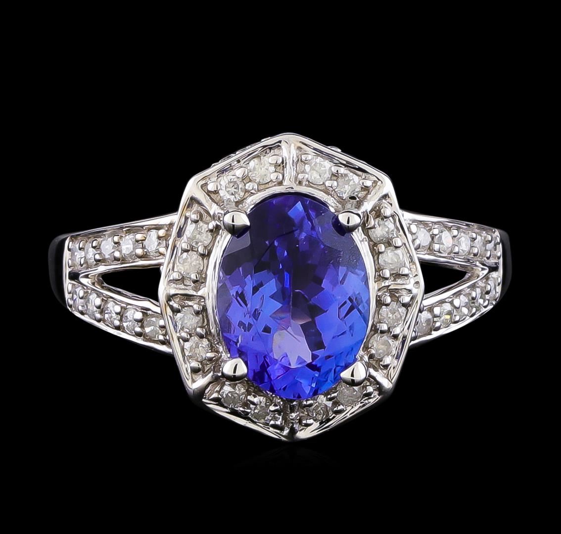 One electronically tested 14KT white gold ladies cast tanzanite and diamond ring with a bright polish finish. The featured tanzanite is set within a stylized diamond bezel supported by diamond set split shoulders, completed by a one and one-half millimeter wide band. Trademark is Orianne. Identified with markings of "14K". Condition is new, good workmanship. Containing: One prong set oval mixed cut natural tanzanite approximate weight of 1.79ct., clarity is slightly included, type I, medium dark, very slightly grayish, bluish violet color, (GIA bV 6/3), cut is good. Transmitting light with a minimum of distortion, transparent. Naturally occurring internal & external characteristics are present. Graded in the setting. Tanzanite is a very rare gemstone that is only found in the country of Tanzania. Originally discovered in 1967. Tiffany & Company, named the stone Tanzanite. It is found in the Usumburu Mountains that border the Umba Valley of northern Tanzania. Tanzanite occurs in gray, brown, violet, blue, reddish-purple, & green. The gem is interesting because of its exceptional pleochroism. Rotated in different directions a tanzanite will exhibit multiple changes of color. Tanzanite has a low tolerance to ultrasonic cleaning, and should not be cleaned using this method. Fifty-Two prong set round brilliant cut diamonds approximate total weight of 52 Stones = 0.34ct. Graded in the setting. Clarity: I-2 to I-3. Color: H - J. Total Weight of Colored Stones 1.79ct. Total Weight of Diamonds 0.34ct. Total Weight of Ring 3.49gm. AIG Appraised at $4,550.00.