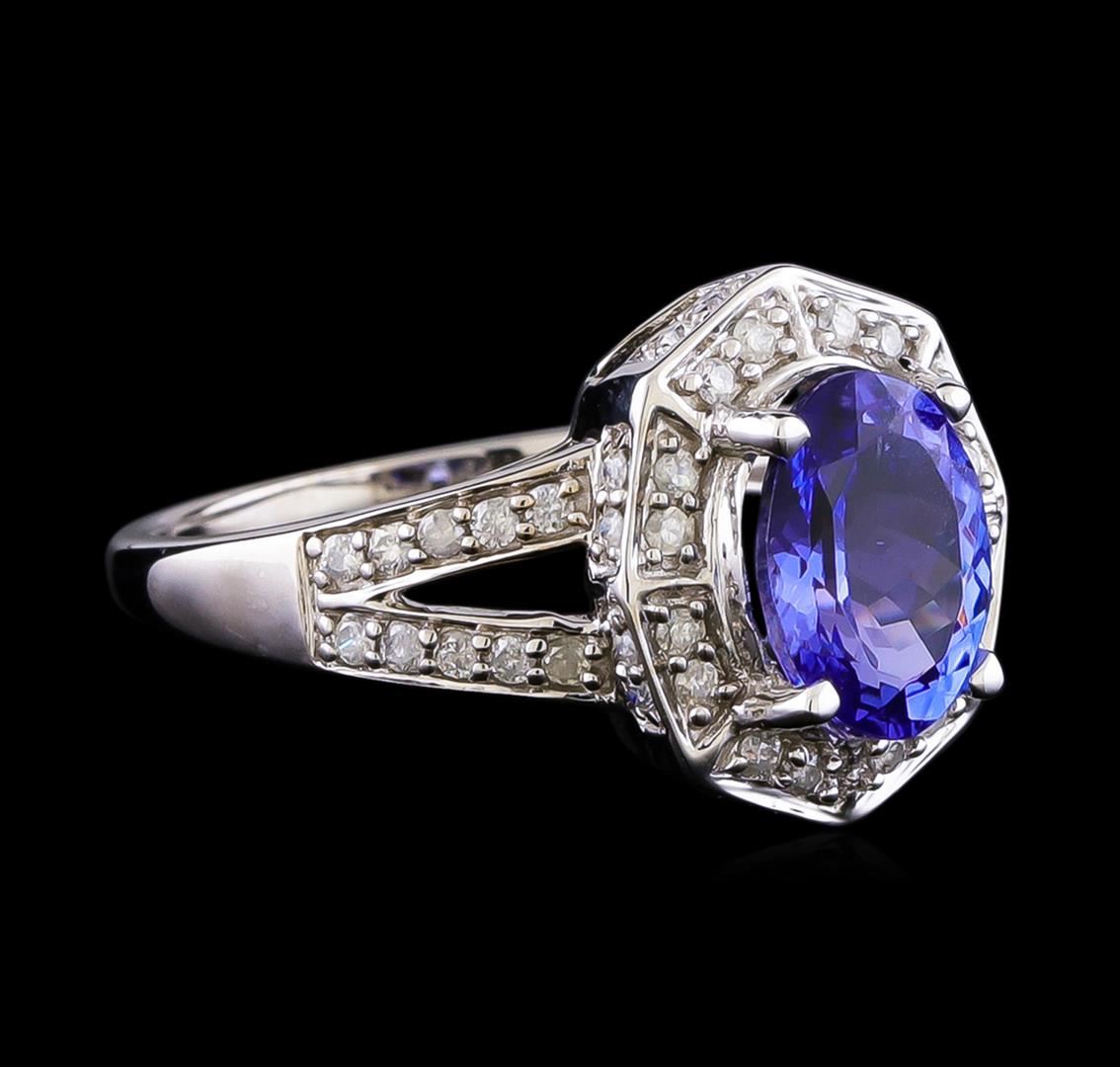 One electronically tested 14KT white gold ladies cast tanzanite and diamond ring with a bright polish finish. The featured tanzanite is set within a stylized diamond bezel supported by diamond set split shoulders, completed by a one and one-half millimeter wide band. Trademark is Orianne. Identified with markings of "14K". Condition is new, good workmanship. Containing: One prong set oval mixed cut natural tanzanite approximate weight of 1.79ct., clarity is slightly included, type I, medium dark, very slightly grayish, bluish violet color, (GIA bV 6/3), cut is good. Transmitting light with a minimum of distortion, transparent. Naturally occurring internal & external characteristics are present. Graded in the setting. Tanzanite is a very rare gemstone that is only found in the country of Tanzania. Originally discovered in 1967. Tiffany & Company, named the stone Tanzanite. It is found in the Usumburu Mountains that border the Umba Valley of northern Tanzania. Tanzanite occurs in gray, brown, violet, blue, reddish-purple, & green. The gem is interesting because of its exceptional pleochroism. Rotated in different directions a tanzanite will exhibit multiple changes of color. Tanzanite has a low tolerance to ultrasonic cleaning, and should not be cleaned using this method. Fifty-Two prong set round brilliant cut diamonds approximate total weight of 52 Stones = 0.34ct. Graded in the setting. Clarity: I-2 to I-3. Color: H - J. Total Weight of Colored Stones 1.79ct. Total Weight of Diamonds 0.34ct. Total Weight of Ring 3.49gm. AIG Appraised at $4,550.00.