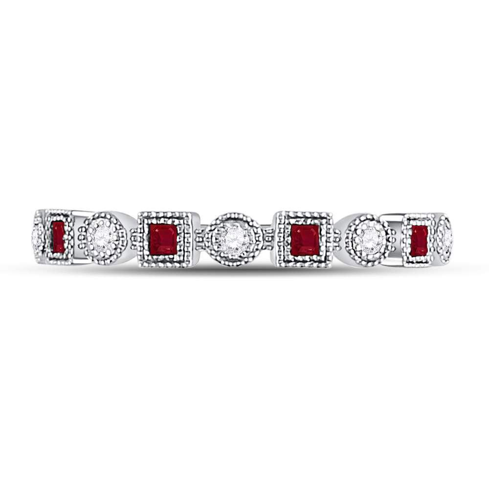 10kt White Gold Womens Princess Ruby Diamond Square Dot Milgrain Stackable Band Ring 1/8 Cttw