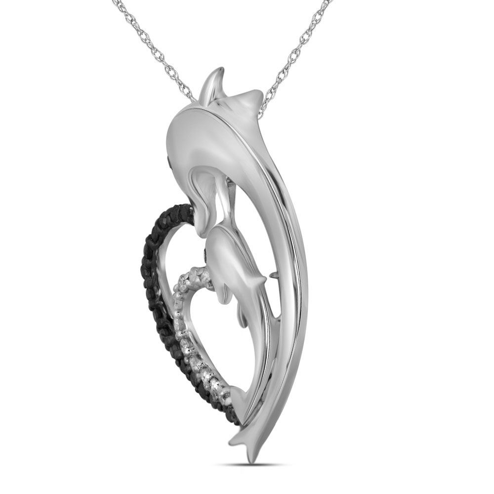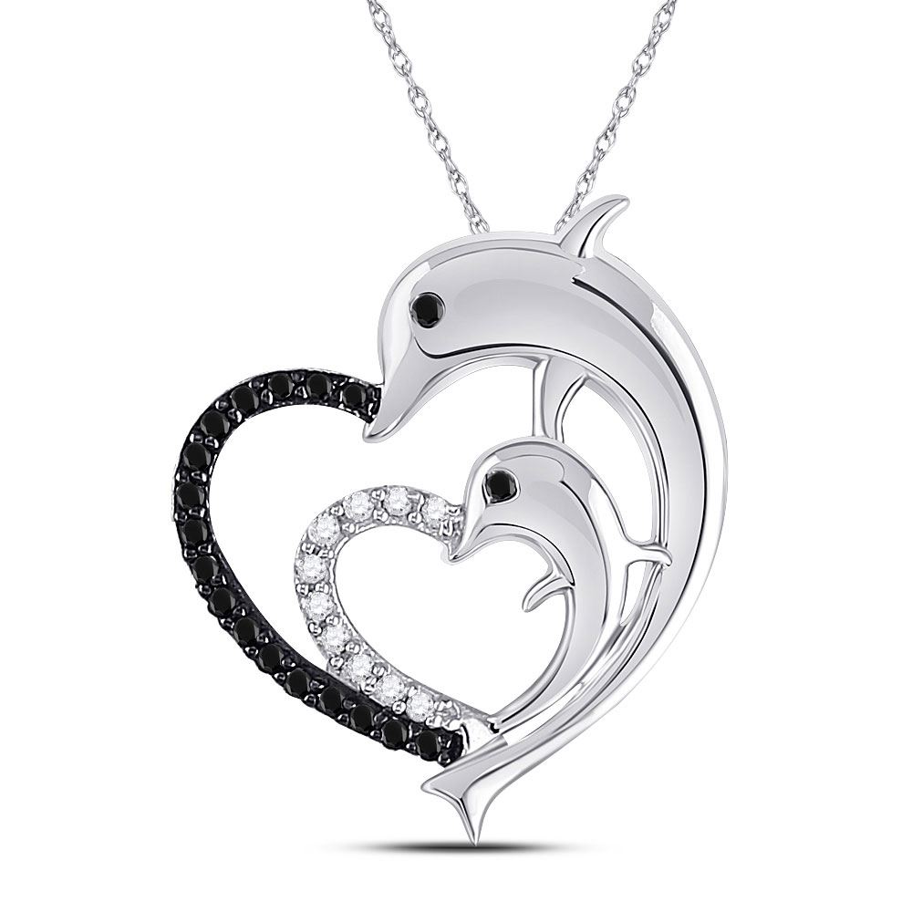 REF-8T4K ---- 1/8 CTW Round Black Color Enhanced Diamond Dolphin Heart Pendant 10kt White Gold