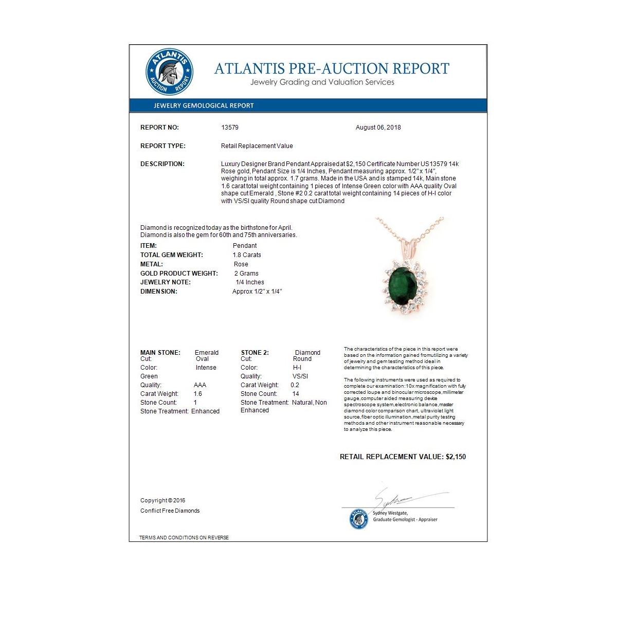 REF-32X8T -13579 ---- 1.80 CTW Emerald & Diamond Pendant 14K Rose Gold ---- Luxury Designer Brand Pendant Appraised at $2,150 Certificate Number US13579 14k Rose gold, Pendant Size is 1/4 Inches, Pendant measuring approx. 1/2" x 1/4", weighing in total approx. 1.7 grams. Made in the USA and is stamped 14k, Main stone 1.6 carat total weight containing 1 pieces of Intense Green color with AAA quality Oval shape cut Emerald , Stone #2 0.2 carat total weight containing 14 pieces of H-I color with VS/SI quality Round shape cut Diamond