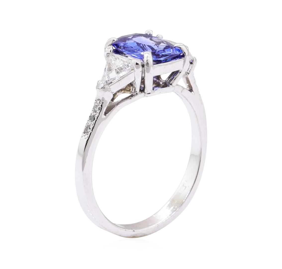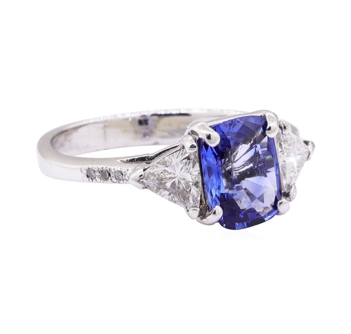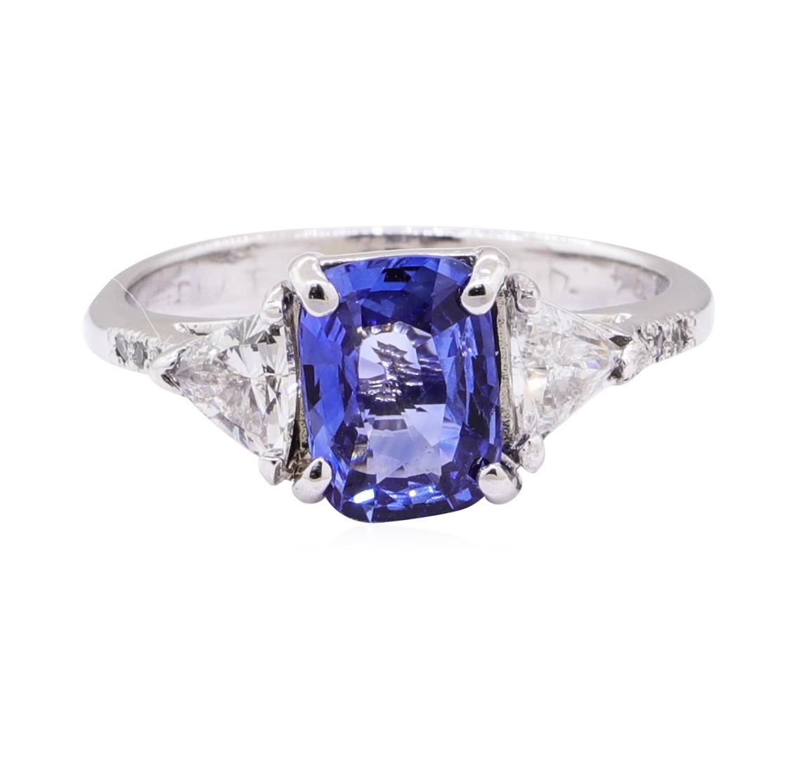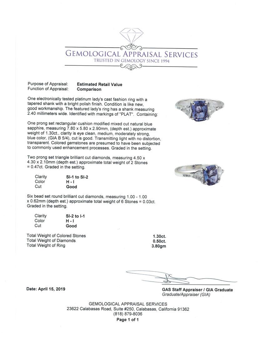 One electronically tested platinum lady's cast fashion ring with a tapered shank with a bright polish finish. The featured lady's ring has a shank measuring 2.40 millimeters wide. Identified with markings of 'PLAT'. Condition is like new, good workmanship. Containing: One prong set rectangular cushion modified mixed cut natural blue sapphire, measuring 7.80 x 5.80 x 2.90mm, (depth est.) approximate weight of 1.30ct., clarity is eye clean, medium, moderately strong, blue color, (GIA B 5/4), cut is good. Transmitting light with no distortion, transparent. Colored gemstones are presumed to have been subjected to commonly used enhancement processes. Graded in the setting. Two prong set triangle brilliant cut diamonds, measuring 4.50 x 4.30 x 2.10mm (depth est.) approximate total weight of 2 Stones = 0.47ct. Graded in the setting. Color H - I Clarity SI-1 to SI-2 Cut Good Six bead set round brilliant cut diamonds, measuring 1.00 - 1.00 x 0.62mm (depth est.) approximate total weight of 6 Stones = 0.03ct. Graded in the setting. Color H - I Clarity SI-2 to I-1 Cut Good. Total Weight of Colored Stones 1.30ct.. Total Weight of Diamonds 0.50ct.. Total Weight of Ring 3.80gm GAS Appraised at $4180.00. GAS Appraised at $4,180.00.