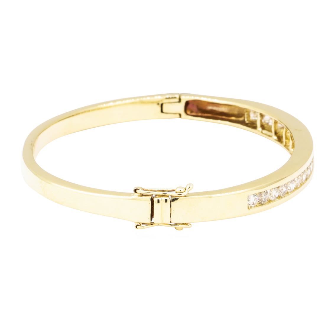 One electronically tested 14KT yellow gold lady's combination cast & assembled fashion bangle bracelet with a tongue clasp with double foldover safeties with a bright polish finish. The featured lady's bracelet has a circumference of approximately six and a half inches. Identified with markings of '14K 585'. Condition is like new, good workmanship. Containing: Twenty-Two channel set round brilliant cut diamonds, measuring 2.80 - 2.70 x 1.71mm (depth est.) approximate total weight of 22 Stones = 1.80ct. Graded in the setting. Color I - J Clarity VS-2 to SI-1 Cut Good. Total Weight of Diamonds 1.80ct.. Total Weight of Bangle Bracelet 19.00gm GAS Appraised at $7650.00. GAS Appraised.