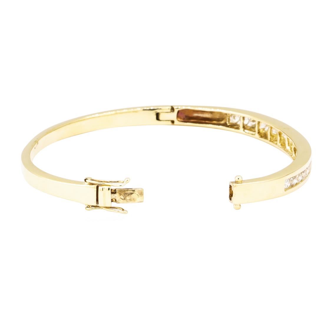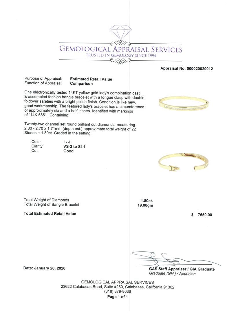 One electronically tested 14KT yellow gold lady's combination cast & assembled fashion bangle bracelet with a tongue clasp with double foldover safeties with a bright polish finish. The featured lady's bracelet has a circumference of approximately six and a half inches. Identified with markings of '14K 585'. Condition is like new, good workmanship. Containing: Twenty-Two channel set round brilliant cut diamonds, measuring 2.80 - 2.70 x 1.71mm (depth est.) approximate total weight of 22 Stones = 1.80ct. Graded in the setting. Color I - J Clarity VS-2 to SI-1 Cut Good. Total Weight of Diamonds 1.80ct.. Total Weight of Bangle Bracelet 19.00gm GAS Appraised at $7650.00. GAS Appraised.