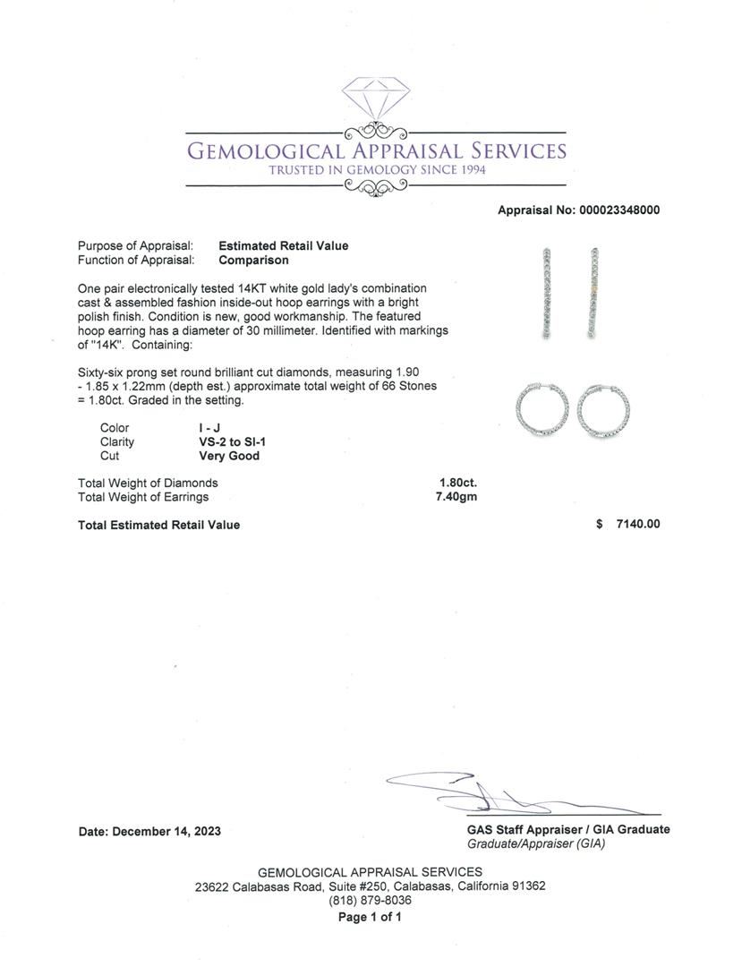 One pair electronically tested 14KT white gold lady's combination cast & assembled fashion inside-out hoop earrings with a bright polish finish. The featured hoop earring has a diameter of 30 millimeter. Identified with markings of "14K". Condition is new, good workmanship.Containing: Sixty-Six prong set round brilliant cut diamonds, measuring 1.90 - 1.85 x 1.22mm (depth est.) approximate total weight of 66 Stones = 1.80ct. Graded in the setting.Color I - JClarity VS-2 to SI-1 Cut Very Good Total Weight of Diamonds 1.80ct. Total Weight of Earrings 7.40gm Estimated Retail Value 7140