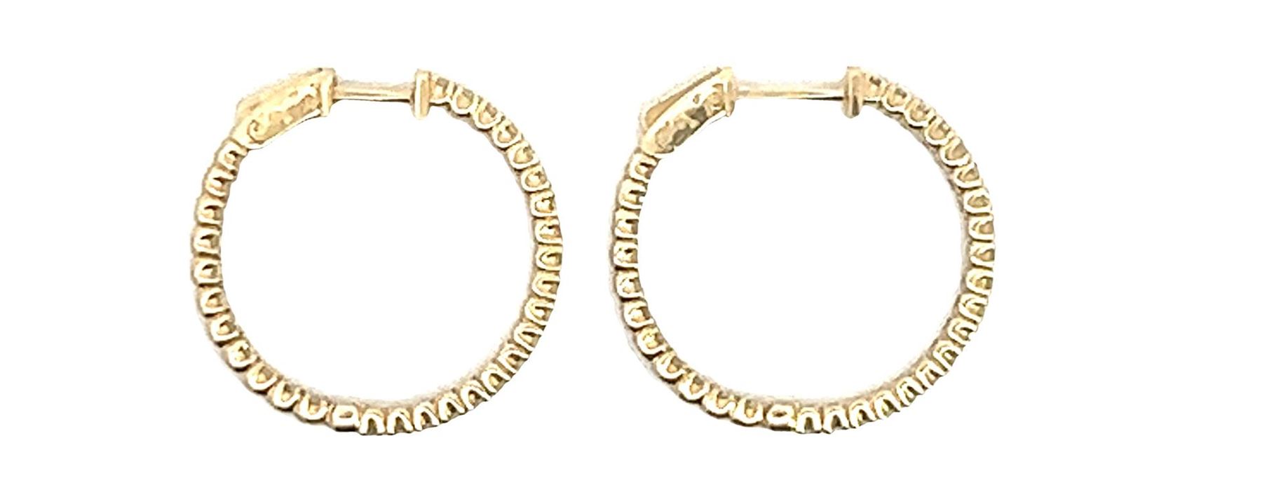 One pair electronically tested 14KT yellow gold lady's combination cast & assembled fashion inside-out hoop earrings with hinged, snap locking posts with a bright polish finish. The featured hoop earring has a diameter of 29.00 millimeter. Identified with markings of "14K". Condition is new, good workmanship. Containing: Sixty prong set round brilliant cut diamonds, measuring 2.00 - 1.90 x 1.25mm (depth est.) approximate total weight of 60 Stones = 1.80ct. Graded in the setting. Color I - K Clarity VS-2 to SI-1 Cut Very Good Total Weight of Diamonds 1.80ct. Total Weight of Earrings 7.90gm Estimated Retail Value $ 7460.00