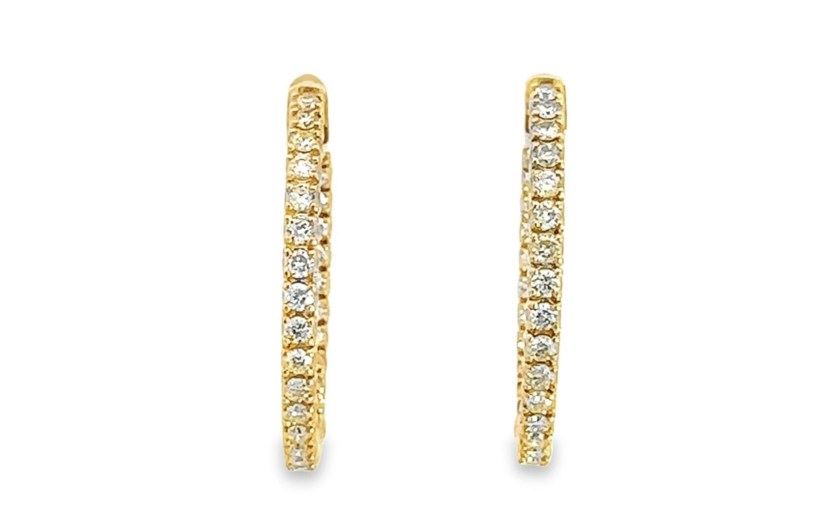 One pair electronically tested 14KT yellow gold lady's combination cast & assembled fashion inside-out hoop earrings with hinged, snap locking posts with a bright polish finish. The featured hoop earring has a diameter of 29.00 millimeter. Identified with markings of "14K". Condition is new, good workmanship. Containing: Sixty prong set round brilliant cut diamonds, measuring 2.00 - 1.90 x 1.25mm (depth est.) approximate total weight of 60 Stones = 1.80ct. Graded in the setting. Color I - K Clarity VS-2 to SI-1 Cut Very Good Total Weight of Diamonds 1.80ct. Total Weight of Earrings 7.90gm Estimated Retail Value $ 7460.00