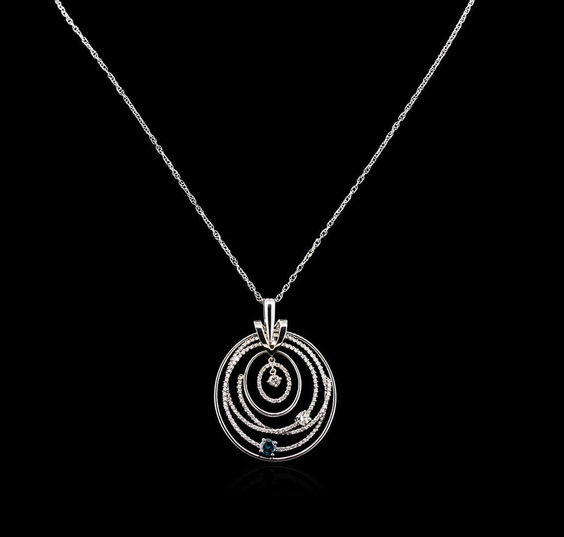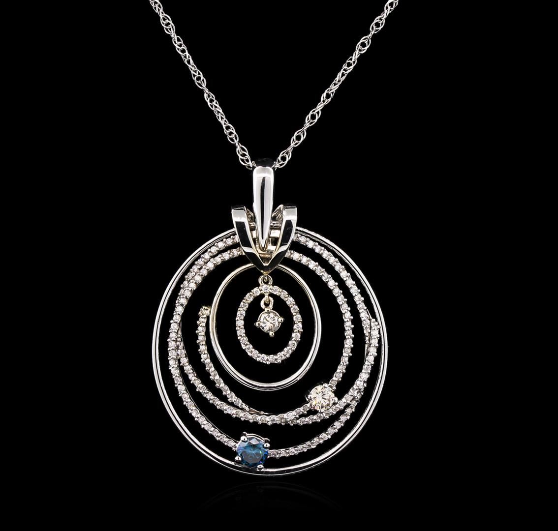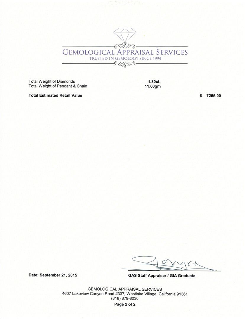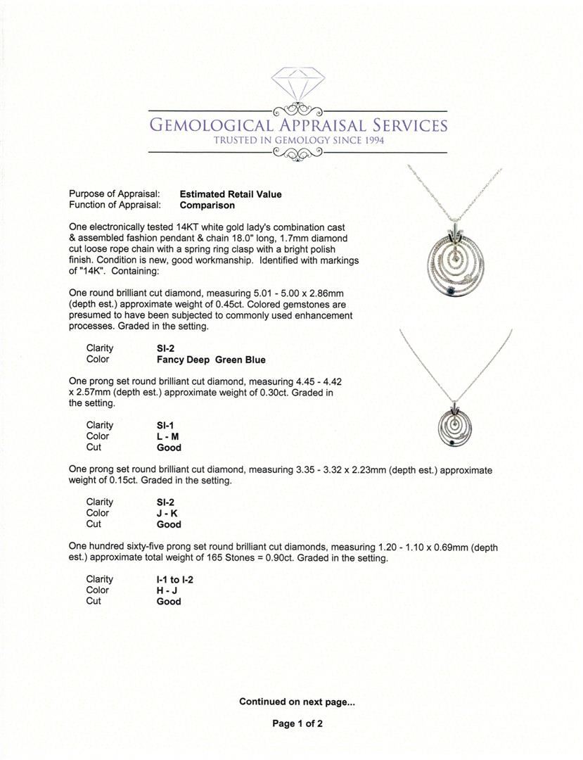 One electronically tested 14KT white gold lady's combination cast & assembled fashion pendant & chain 18.0" long, 1.7mm diamond cut loose rope chain with a spring ring clasp with a bright polish finish. Identified with markings of "14K". Condition is new, good workmanship. Containing: One round brilliant cut diamond, measuring 5.01 - 5.00 x 2.86mm (depth est.) approximate weight of 0.45ct. Colored gemstones are presumed to have been subjected to commonly used enhancement processes. Graded in the setting. Clarity: SI-2 One prong set round brilliant cut diamond, measuring 4.45 - 4.42 x 2.57mm (depth est.) approximate weight of 0.30ct. Graded in the setting. Clarity: SI-1. Color: L - M. Cut Good One prong set round brilliant cut diamond, measuring 3.35 - 3.32 x 2.23mm (depth est.) approximate weight of 0.15ct. Graded in the setting. Clarity: SI-2. Color: J - K. Cut Good One Hundred Sixty-Five prong set round brilliant cut diamonds, measuring 1.20 - 1.10 x 0.69mm (depth est.) approximate total weight of 165 Stones = 0.90ct. Graded in the setting. Clarity: I-1 to I-2. Color: H - Good. Total Weight of Diamonds 1.80ct. Total Weight of Pendant & Chain 11.60gm at $7255.00.. GAS Appraised at $7,255.00.