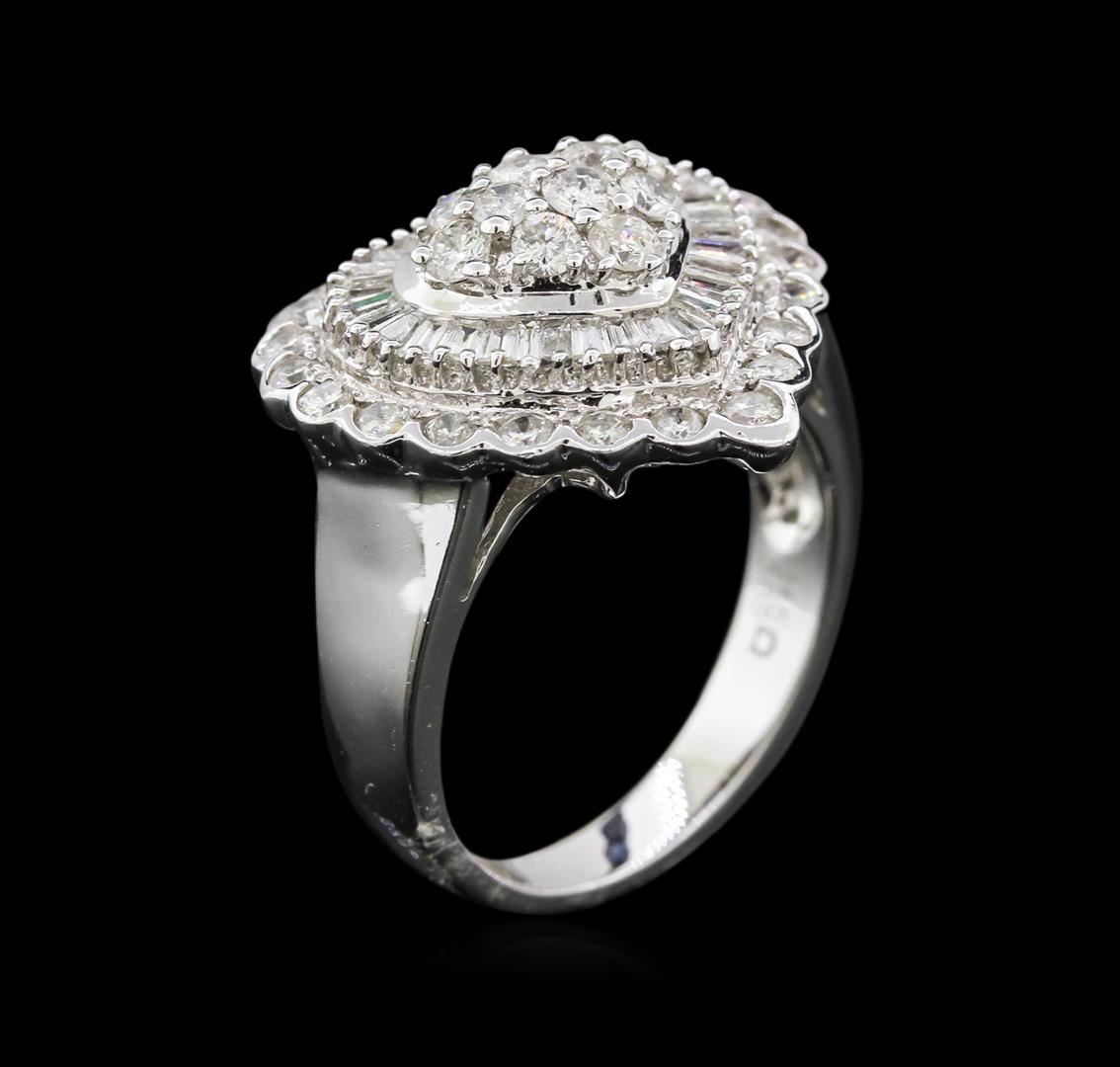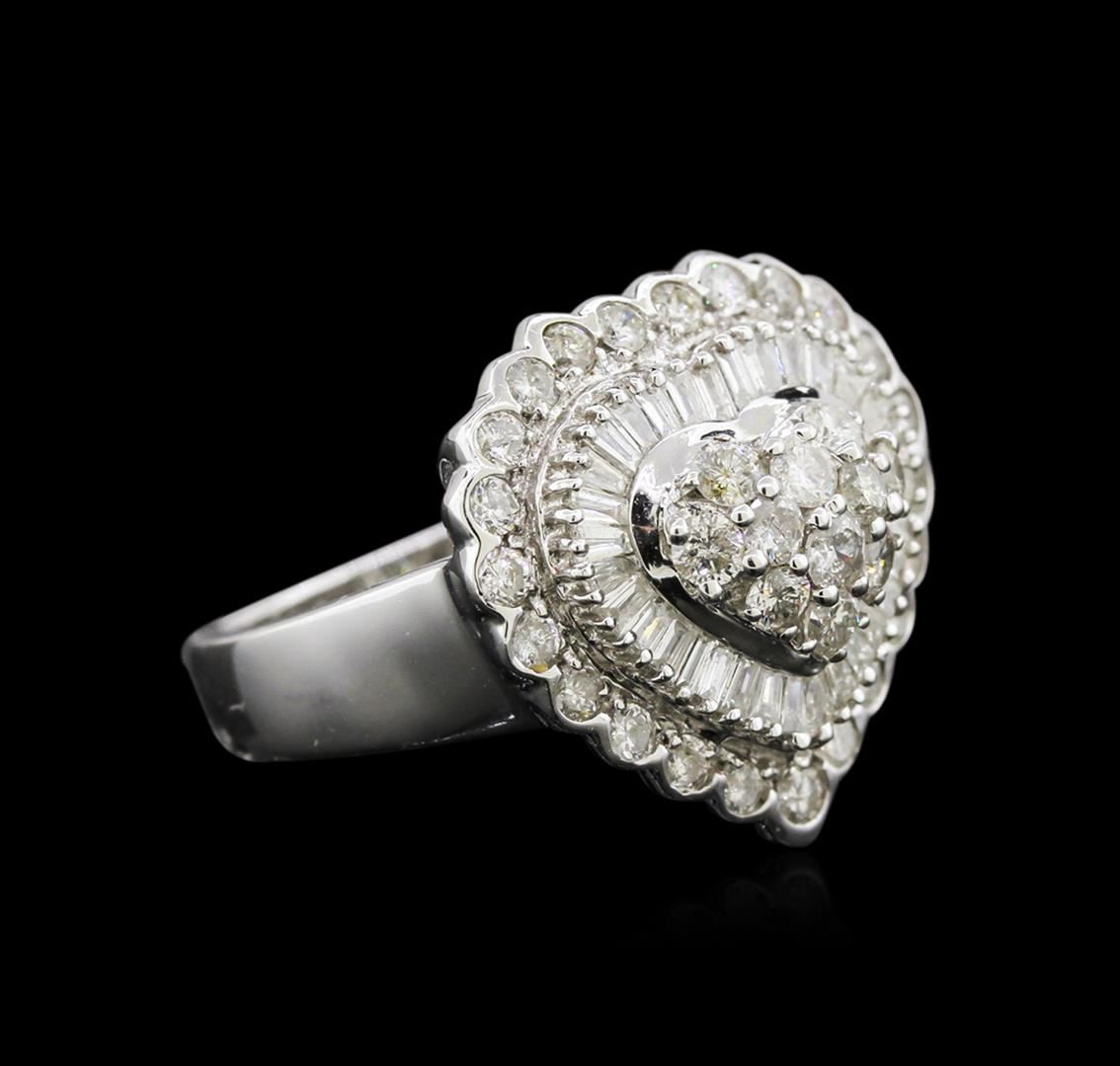 One electronically tested white gold ladies cast diamond cluster ring with a bright finish. Condition is good. The ring features a series of tiered diamond clusters set in a heart shape, supported by tapering shoulders, completed by a three millimeter wide band. Identified with markings of "14K 585". Containing: Thirty-four prong set round brilliant cut diamonds, measuring 2.60 - 2.10 x 1.41mm (depth est.) approximate total weight of 34 Stones = 1.20ct. Graded in the setting. Clarity: 1-1 to 1-2. Color: H-J. Thirty-two channel set baguette cut (tapered) diamonds, measuring from 2.00 x 1.20 x 0.80mm (depth est.) to2.10 x 1.40 x 0.95mm (depth est.) approximate total weight of 32 Stones = 0.60ct. Graded in the setting. Clarity: SI-1 to 1-1. Color: H - I. AIG Appraised at $7,500.00.