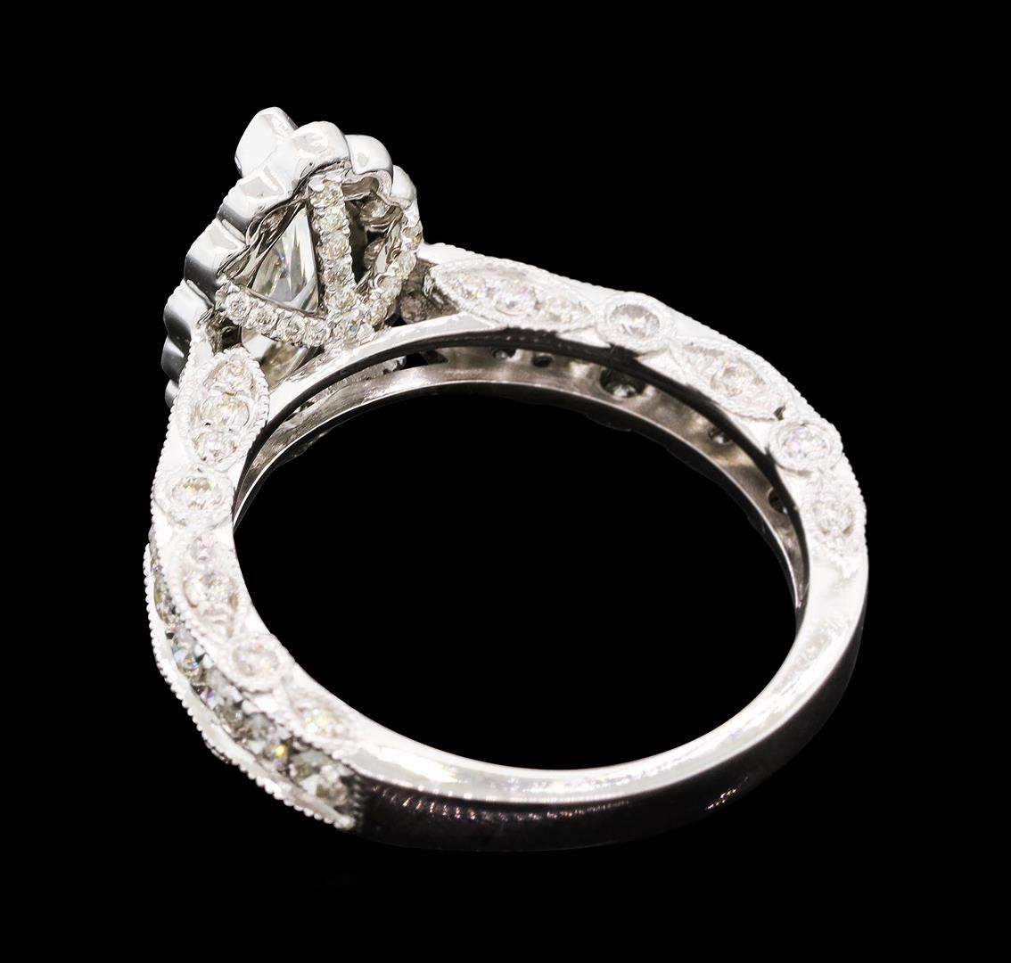 One electronically tested 14KT white gold lady's cast vintage style wedding ring with a cathedral shank with a basket halo with a bright polish with milgrain detailing finish. The featured lady's ring has a shank measuring 2.58 millimeters wide. Identified with markings of '14K'. Condition is new, good workmanship. Containing: One prong set marquise shaped cut diamond, measuring 9.25 x 4.60 x 2.66mm (depth est.) , 5.00.%. GTCF approximate weight of 0.71ct. Graded in the setting. Color J - K Clarity VS-2 Cut Very Good Eighteen prong set round brilliant cut diamonds, measuring 2.00 - 1.90 x 1.21mm (depth est.) approximate total weight of 18 Stones = 0.50ct. Graded in the setting. Color H - I Clarity SI-1 to I-1 Cut Good Twenty-Two prong set round brilliant cut diamonds, measuring 1.70 - 1.60 x 1.02mm (depth est.) approximate total weight of 22 Stones = 0.37ct. Graded in the setting. Color H - I Clarity SI-1 to SI-2 Cut Good Forty-Eight prong set round brilliant cut diamonds, measuring 1.40 - 1.00 x 0.72mm (depth est.) approximate total weight of 48 Stones = 0.22ct. Graded in the setting. Color H - I Clarity SI-1 to SI-2 Cut Good. Total Weight of Diamonds 1.80ct.. Total Weight of Ring 4.20gm GAS Appraised at $7,840.00.