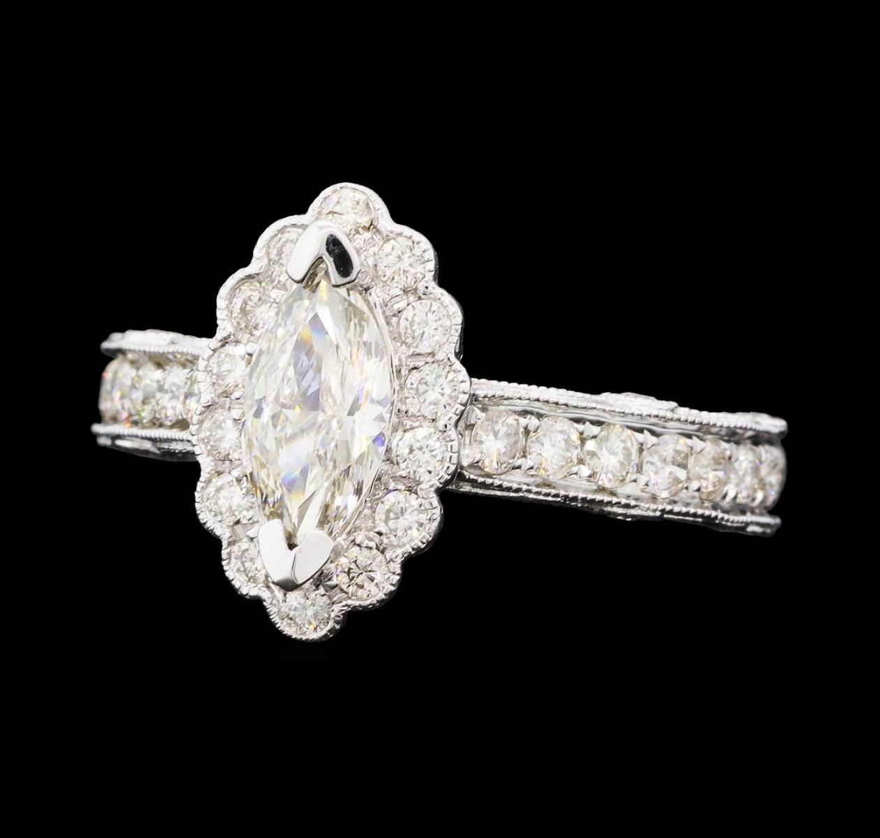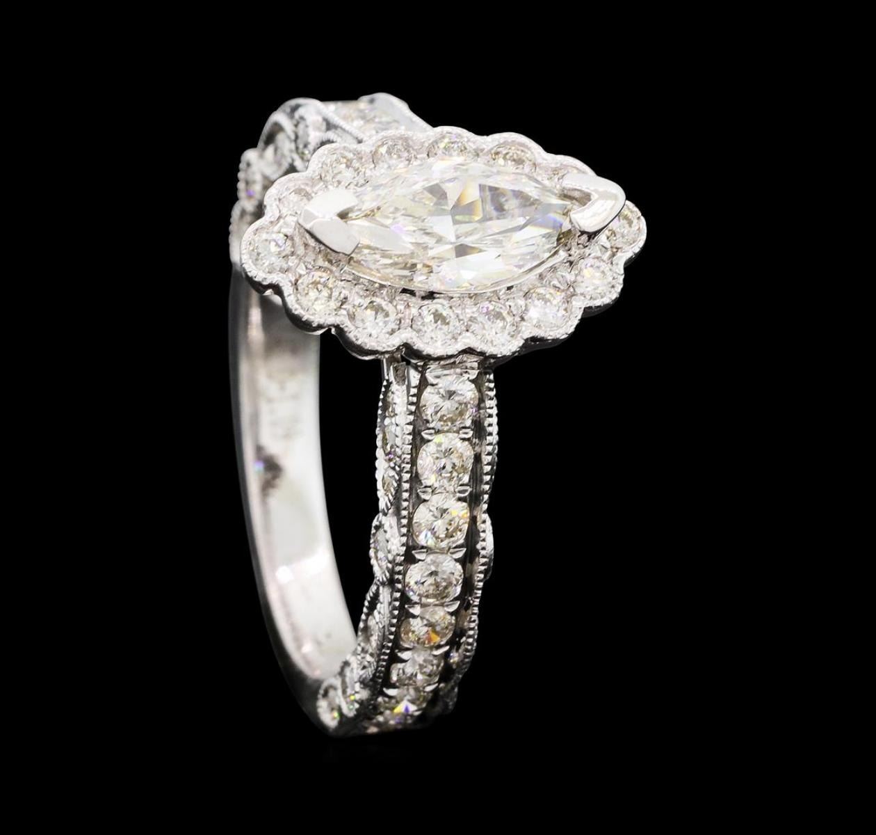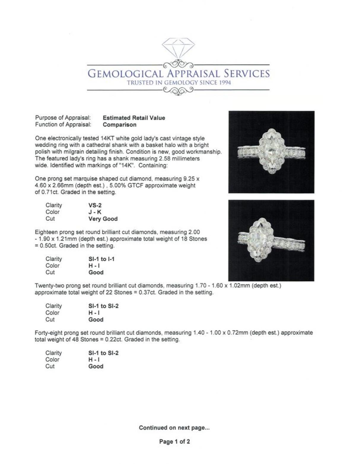 One electronically tested 14KT white gold lady's cast vintage style wedding ring with a cathedral shank with a basket halo with a bright polish with milgrain detailing finish. The featured lady's ring has a shank measuring 2.58 millimeters wide. Identified with markings of '14K'. Condition is new, good workmanship. Containing: One prong set marquise shaped cut diamond, measuring 9.25 x 4.60 x 2.66mm (depth est.) , 5.00.%. GTCF approximate weight of 0.71ct. Graded in the setting. Color J - K Clarity VS-2 Cut Very Good Eighteen prong set round brilliant cut diamonds, measuring 2.00 - 1.90 x 1.21mm (depth est.) approximate total weight of 18 Stones = 0.50ct. Graded in the setting. Color H - I Clarity SI-1 to I-1 Cut Good Twenty-Two prong set round brilliant cut diamonds, measuring 1.70 - 1.60 x 1.02mm (depth est.) approximate total weight of 22 Stones = 0.37ct. Graded in the setting. Color H - I Clarity SI-1 to SI-2 Cut Good Forty-Eight prong set round brilliant cut diamonds, measuring 1.40 - 1.00 x 0.72mm (depth est.) approximate total weight of 48 Stones = 0.22ct. Graded in the setting. Color H - I Clarity SI-1 to SI-2 Cut Good. Total Weight of Diamonds 1.80ct.. Total Weight of Ring 4.20gm GAS Appraised.