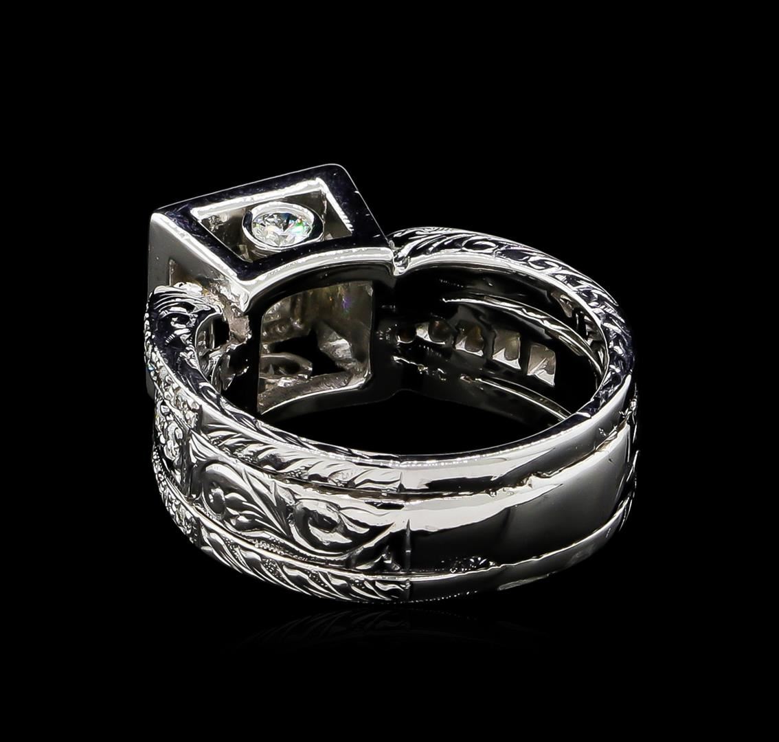 One electronically tested 18KT white gold ladies cast diamond ring. The featured diamond is set within a diamond bezel supported by a diamond set box gallery and engraved diamond set shoulders, completed by a seven millimeter wide band. Bright polish finish with engraving and milgrain detailing. Identified with markings of "18K". Condition is good. Containing: One prong set round brilliant cut diamond, measuring 5.90 - 5.90 x 3.80mm (depth est.) approximate weight of 0.81ct. Graded in the setting. Clarity: I-1. Color: 64.4%. Table 64.4%. Two bezel set round brilliant cut diamonds, measuring 3.20 - 3.10 x 1.89mm (depth est.) approximate total weight of 2 Stones = 0.25ct. Graded in the setting. Clarity: VS-2. Color: G Eight prong set round brilliant cut diamonds, measuring 1.90 - 1.90 x 1.14mm (depth est.) approximate total weight of 8 Stones = 0.21ct. Graded in the setting. Clarity: VS-1 to SI-1. Color: G - I Thirty-Four prong set round brilliant cut diamonds, measuring 1.60 - 1.40 x 0.90mm (depth est.) approximate total weight of 34 Stones = 0.46ct. Graded in the setting. Clarity: VS-2 to SI-2. Color: G - I Eight prong set round brilliant cut diamonds, measuring 1.20 - 1.20 x 0.72mm (depth est.) approximate total weight of 8 Stones = 0.07ct. Graded in the setting. Clarity: SI-1 to SI-2. Color: G - I. Total Weight of Diamonds 1.80ct. Total Weight of Ring 13.93gm. AIG Appraised at $10,740.00.