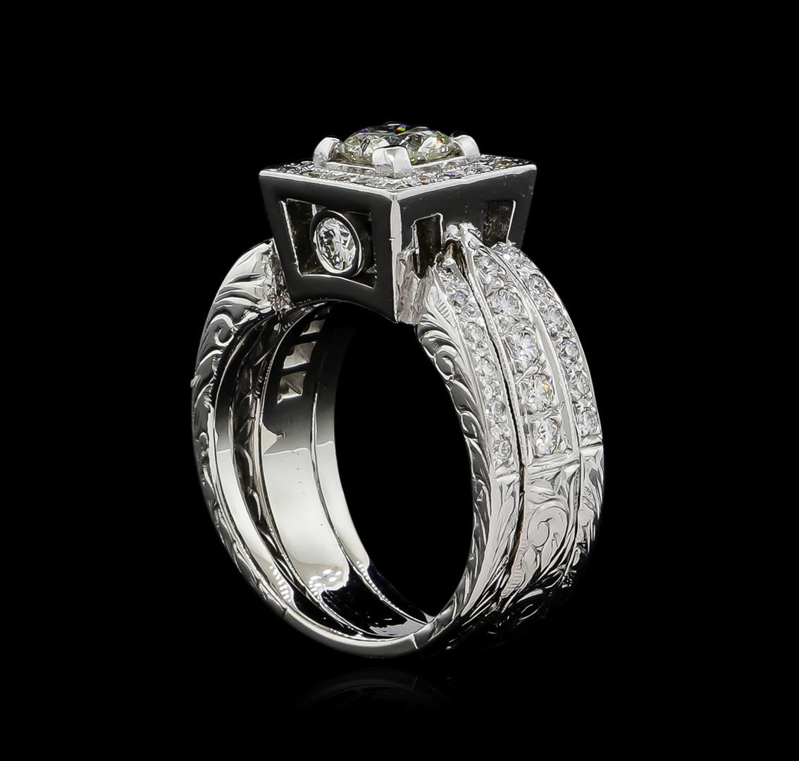 One electronically tested 18KT white gold ladies cast diamond ring. The featured diamond is set within a diamond bezel supported by a diamond set box gallery and engraved diamond set shoulders, completed by a seven millimeter wide band. Bright polish finish with engraving and milgrain detailing. Identified with markings of "18K". Condition is good. Containing: One prong set round brilliant cut diamond, measuring 5.90 - 5.90 x 3.80mm (depth est.) approximate weight of 0.81ct. Graded in the setting. Clarity: I-1. Color: 64.4%. Table 64.4%. Two bezel set round brilliant cut diamonds, measuring 3.20 - 3.10 x 1.89mm (depth est.) approximate total weight of 2 Stones = 0.25ct. Graded in the setting. Clarity: VS-2. Color: G Eight prong set round brilliant cut diamonds, measuring 1.90 - 1.90 x 1.14mm (depth est.) approximate total weight of 8 Stones = 0.21ct. Graded in the setting. Clarity: VS-1 to SI-1. Color: G - I Thirty-Four prong set round brilliant cut diamonds, measuring 1.60 - 1.40 x 0.90mm (depth est.) approximate total weight of 34 Stones = 0.46ct. Graded in the setting. Clarity: VS-2 to SI-2. Color: G - I Eight prong set round brilliant cut diamonds, measuring 1.20 - 1.20 x 0.72mm (depth est.) approximate total weight of 8 Stones = 0.07ct. Graded in the setting. Clarity: SI-1 to SI-2. Color: G - I. Total Weight of Diamonds 1.80ct. Total Weight of Ring 13.93gm. AIG Appraised at $10,740.00.