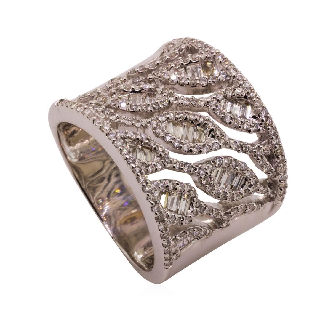 One electronically tested 18KT white gold lady's cast fashion ring with a tapered wide band with a bright polish finish. The featured lady's ring has a concave center motif with raised borders and a shank measuring 10.20 millimeters wide. Identified with markings of '18K'. Condition is new, good workmanship. Containing: Twenty-Five channel set baguette cut diamonds, measuring from 1.90 x 1.30 x 1.11mm (depth est.) to 2.30 x 1.50 x 1.28mm (depth est.) approximate total weight of 25 Stones = 0.80ct. Graded in the setting. Color G - H Clarity VS-1 to VS-2 Cut Very Good One Hundred Ninety prong set round brilliant cut diamonds, measuring 1.15 - 1.10 x 0.68mm (depth est.) approximate total weight of 190 Stones = 1.00ct. Graded in the setting. Color H - I Clarity SI-1 to SI-2 Cut Good. Total Weight of Diamonds 1.80ct.. Total Weight of Ring 14.40gm GAS Appraised at $8070.00. GAS Appraised at $8,070.00.