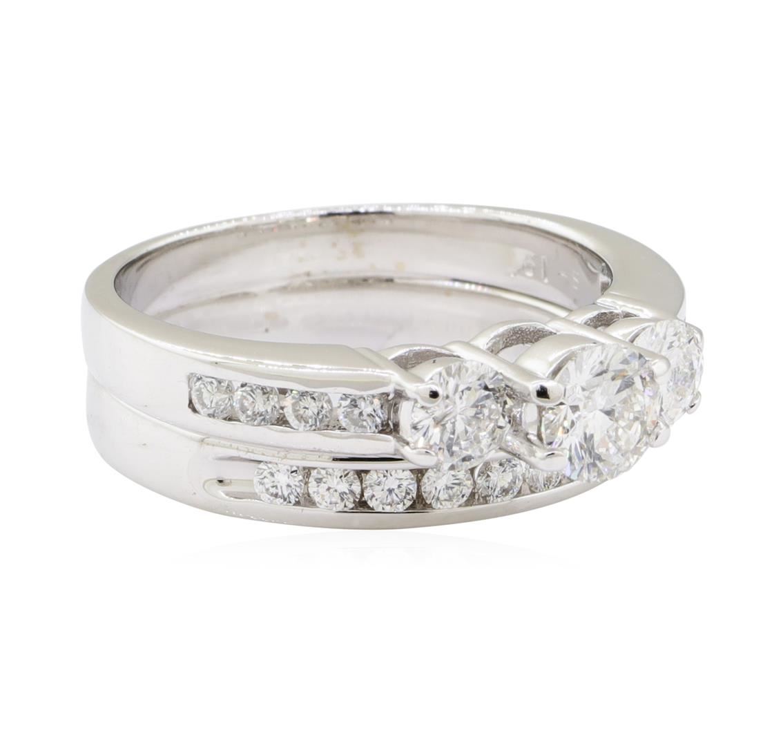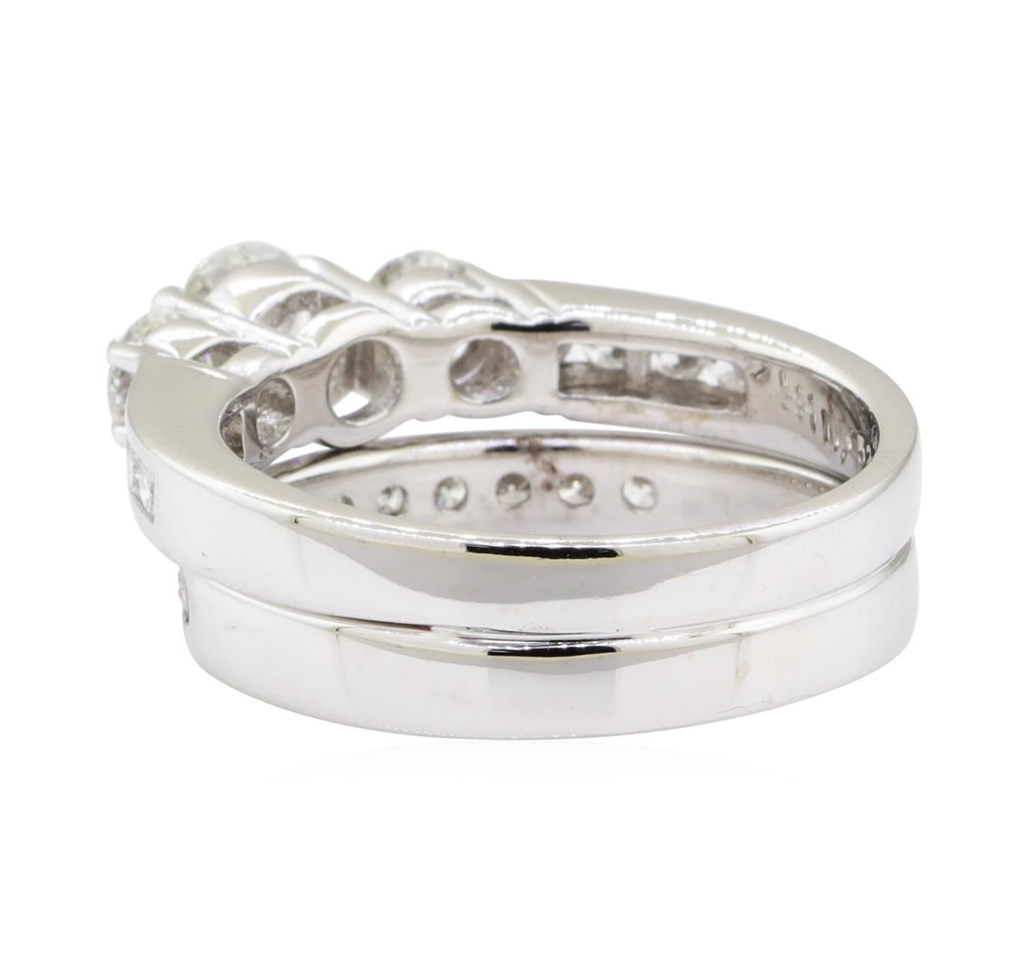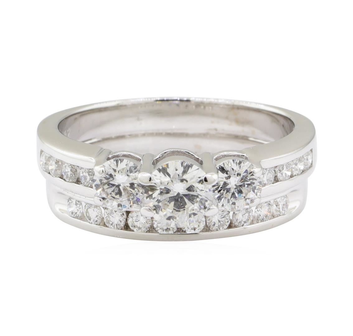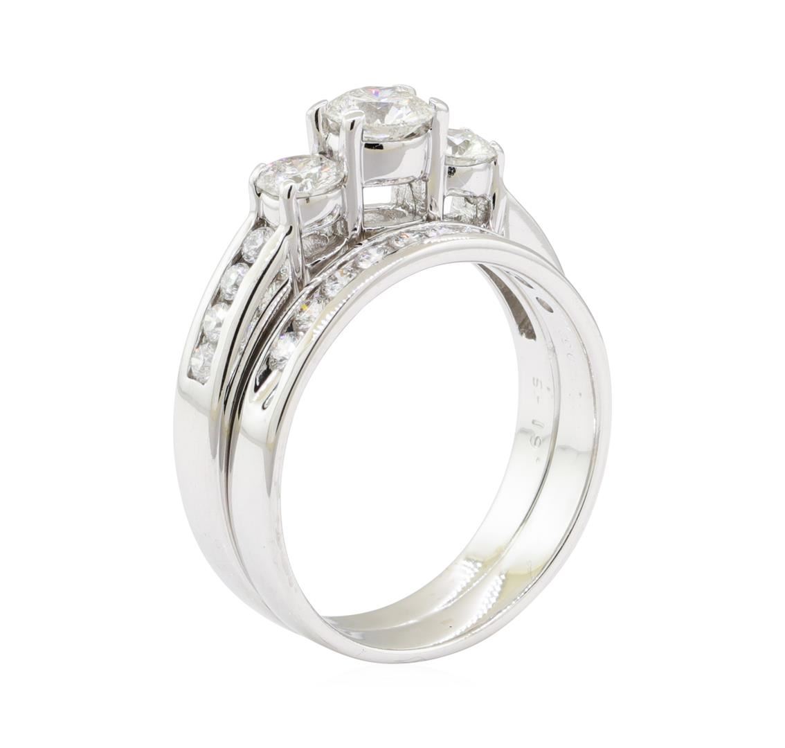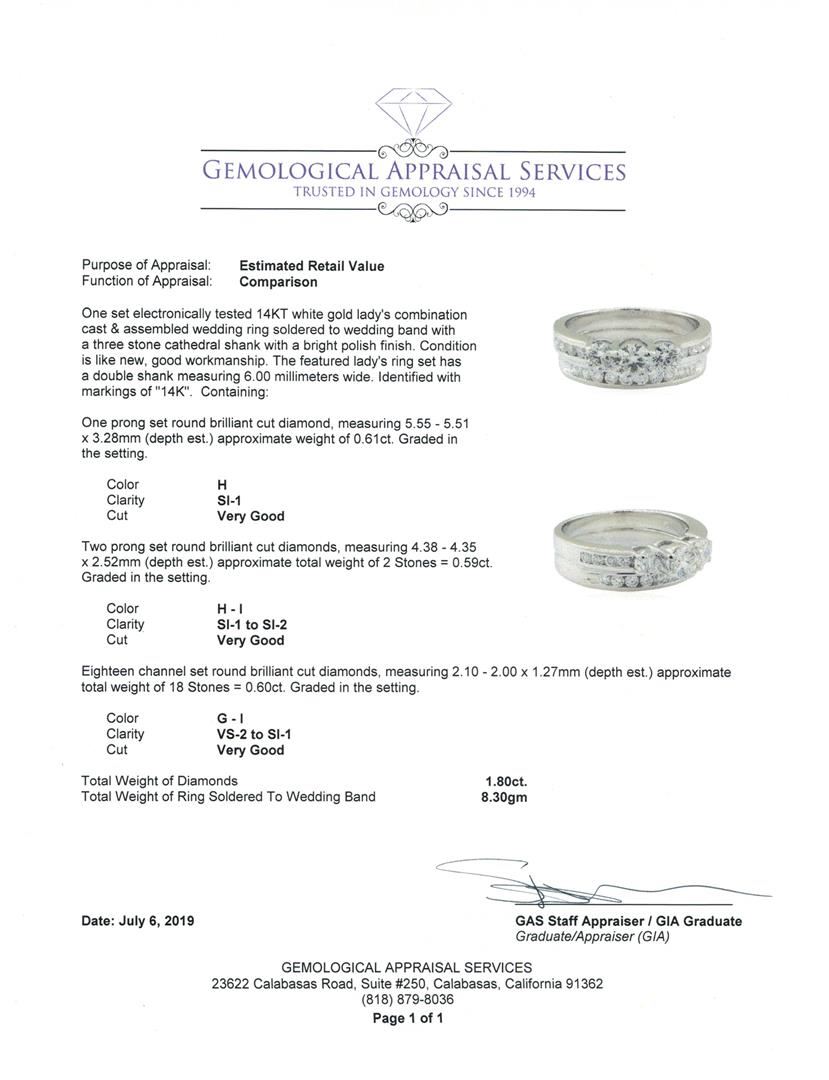 One set electronically tested 14KT white gold lady's combination cast & assembled wedding ring soldered to wedding band with a three stone cathedral shank with a bright polish finish. The featured lady's ring set has a double shank measuring 6.00 millimeters wide. Identified with markings of '14K'. Condition is like new, good workmanship. Containing: One prong set round brilliant cut diamond, measuring 5.55 - 5.51 x 3.28mm (depth est.) approximate weight of 0.61ct. Graded in the setting. Color H Clarity SI-1 Cut Very Good Two prong set round brilliant cut diamonds, measuring 4.38 - 4.35 x 2.52mm (depth est.) approximate total weight of 2 Stones = 0.59ct. Graded in the setting. Color H - I Clarity SI-1 to SI-2 Cut Very Good Eighteen channel set round brilliant cut diamonds, measuring 2.10 - 2.00 x 1.27mm (depth est.) approximate total weight of 18 Stones = 0.60ct. Graded in the setting. Color G - I Clarity VS-2 to SI-1 Cut Very Good. Total Weight of Diamonds 1.80ct.. Total Weight of Ring Soldered To Wedding Band 8.30gm GAS Appraised at $8765.00. GAS Appraised.
