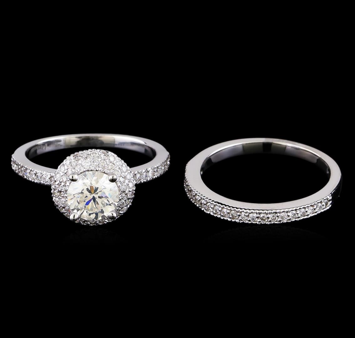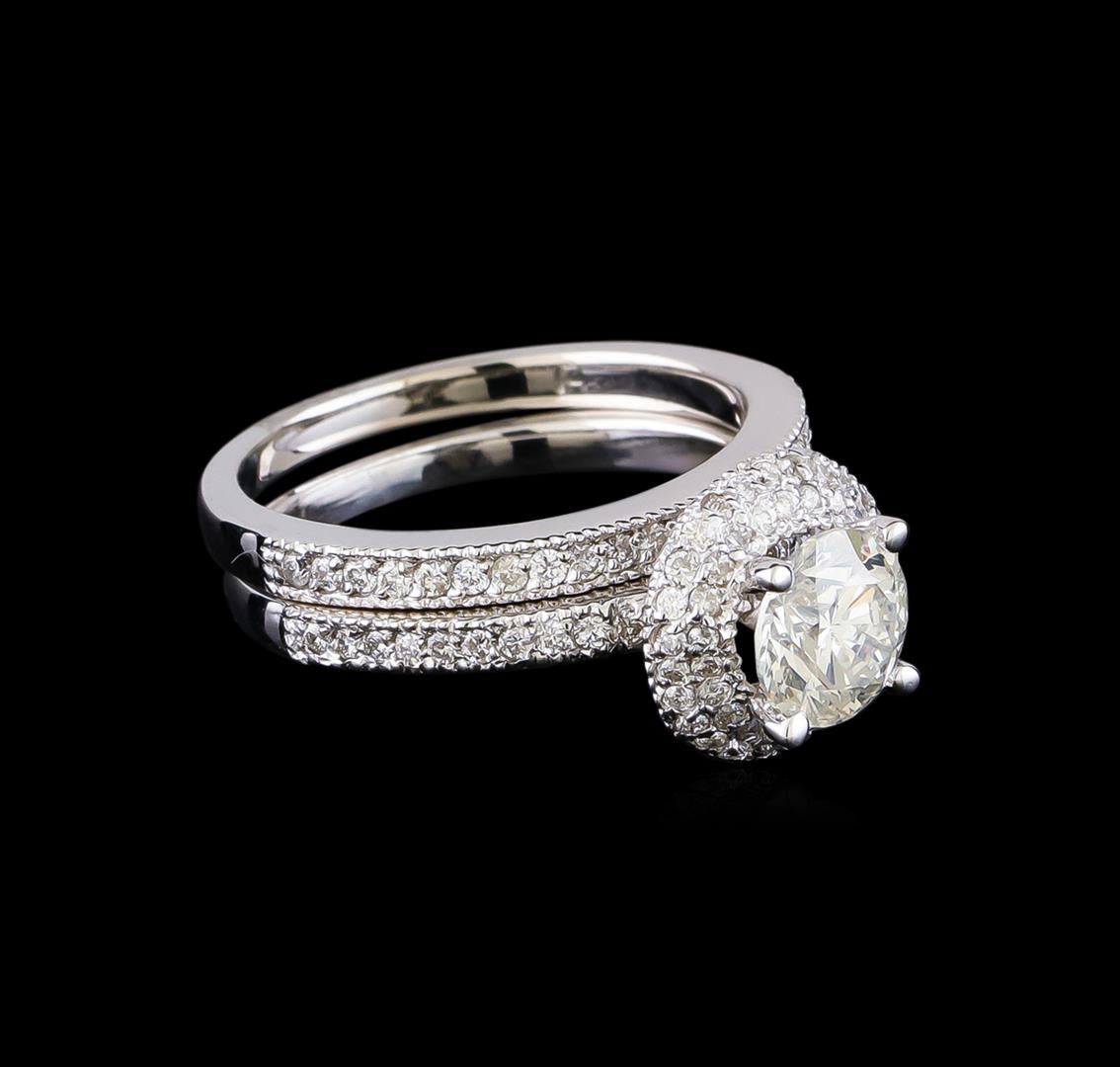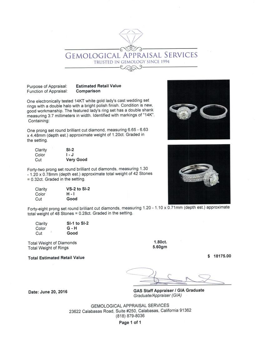 One electronically tested 14KT white gold lady's cast wedding set rings with a double halo with a bright polish finish. The featured lady's ring set has a double shank measuring 3.7 millimeters in width. Identified with markings of "14K". Condition is new, good workmanship. Containing: One prong set round brilliant cut diamond, measuring 6.65 - 6.63 x 4.48mm (depth est.) approximate weight of 1.20ct. Graded in the setting. Clarity: SI-2. Color: I - Very Good Forty-Two prong set round brilliant cut diamonds, measuring 1.30 - 1.20 x 0.78mm (depth est.) approximate total weight of 42 Stones = 0.32ct. Graded in the setting. Clarity: VS-2 to SI-2. Color: H - I. Cut Good Forty-Eight prong set round brilliant cut diamonds, measuring 1.20 - 1.10 x 0.71mm (depth est.) approximate total weight of 48 Stones = 0.28ct. Graded in the setting. Clarity: SI-1 to SI-2. Color: G - Good. Total Weight of Diamonds 1.80ct. Total Weight of Rings 5.60gm GAS Appraised at $18,175.00.